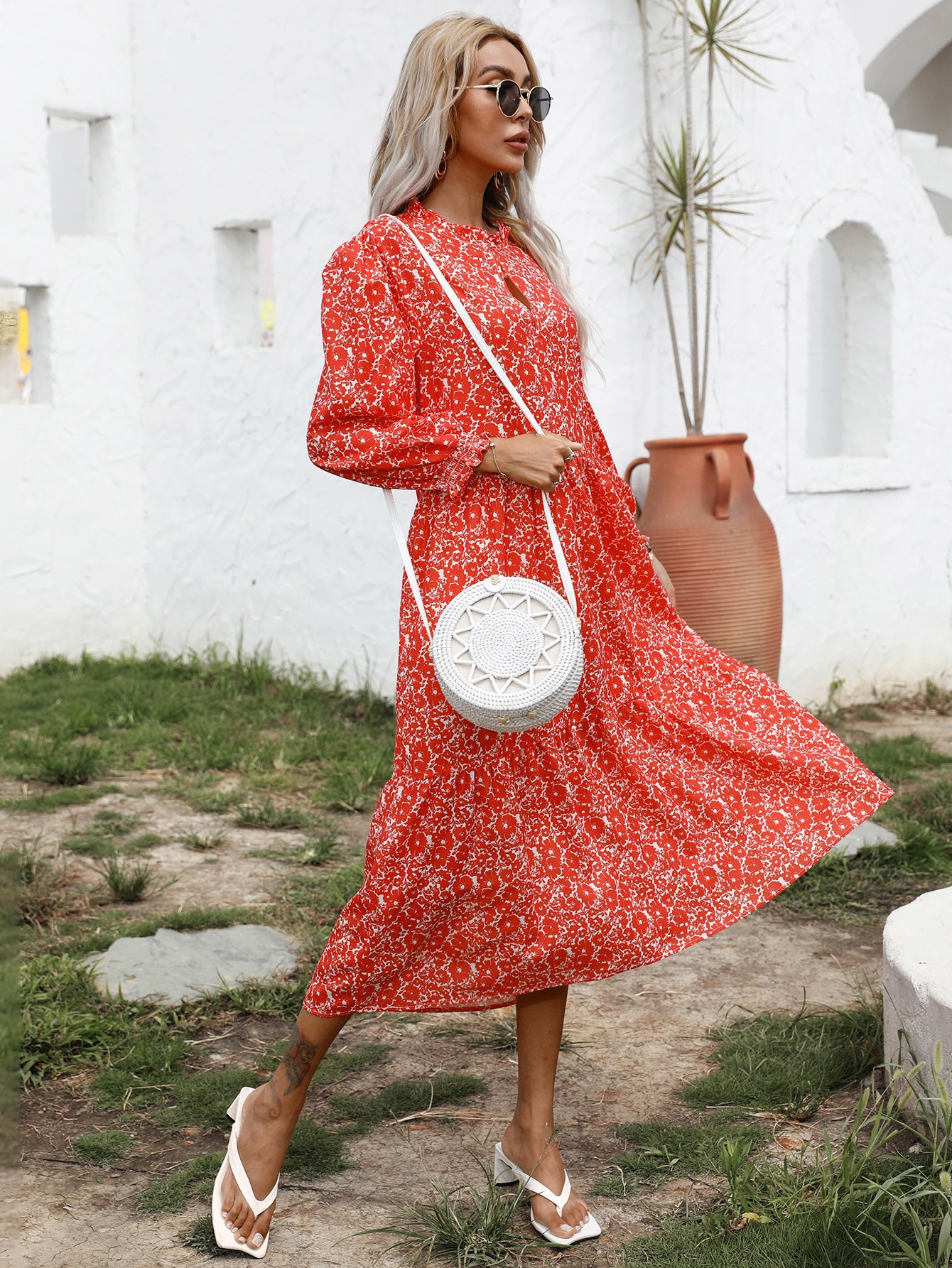 All Over Print Ruffle Neck Long Sleeve Round Neck Flounce High Waist Long Dress