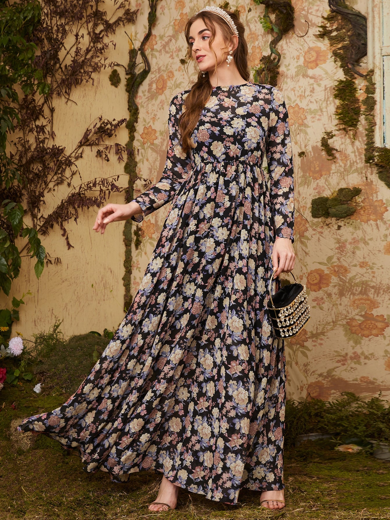 All Over Print Zipper Long Sleeve Round Neck Flared High Waist Maxi Dress
