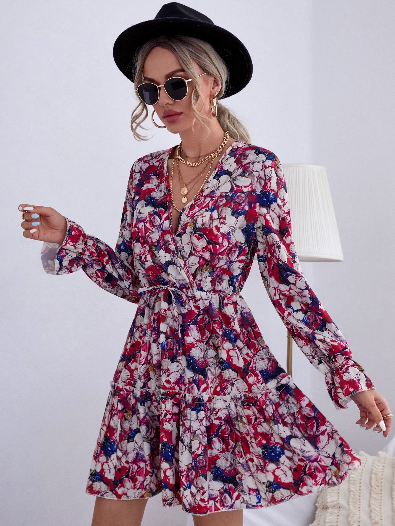 Boho All Over Print Knot Long Sleeve V Neck Flounce High Waist Short Womens Dress