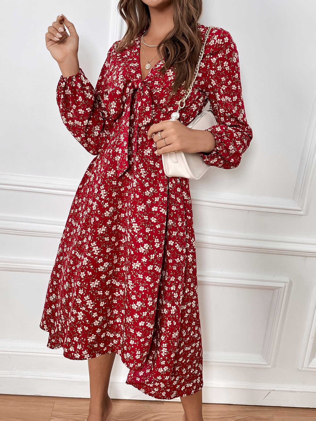 Boho All Over Print Tie Front Long Sleeve V Neck Flared High Waist Long Dress