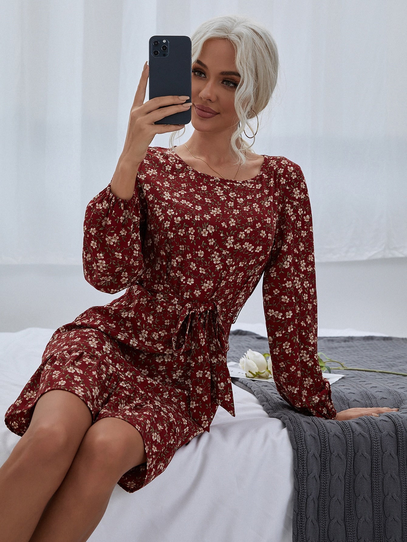 Boho Ditsy Floral Belted Long Sleeve Round Neck Flounce High Waist Short Dress