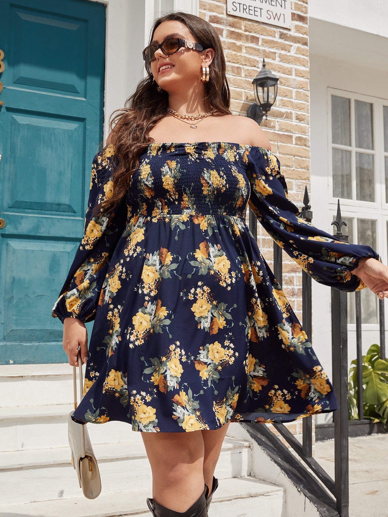 Boho Floral Shirred Long Sleeve Off The Shoulder Flared High Waist Short Plus Size Dress