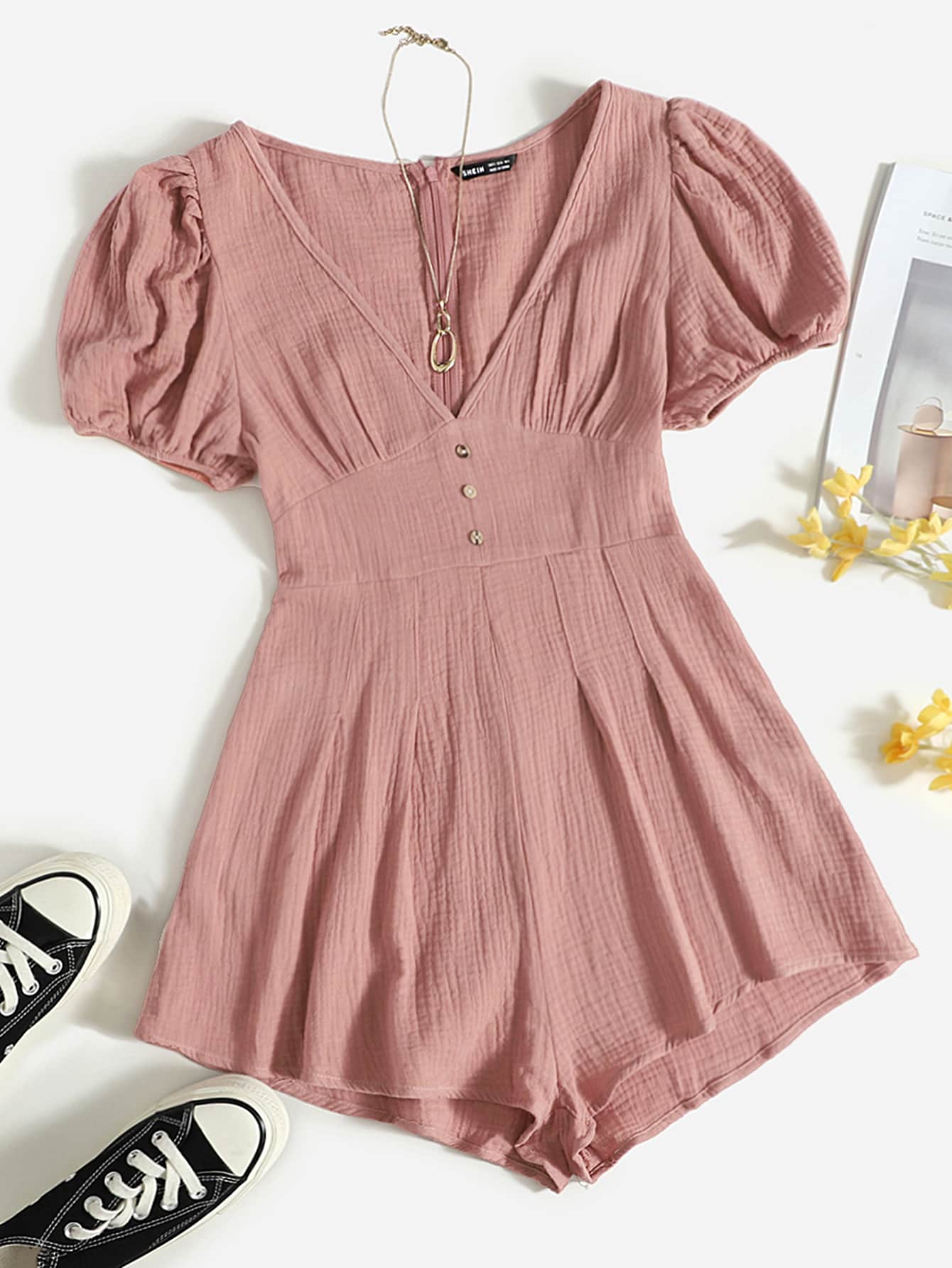 Boho Plain Zipper Short Sleeve V Neck High Waist Short Women Jumpsuit