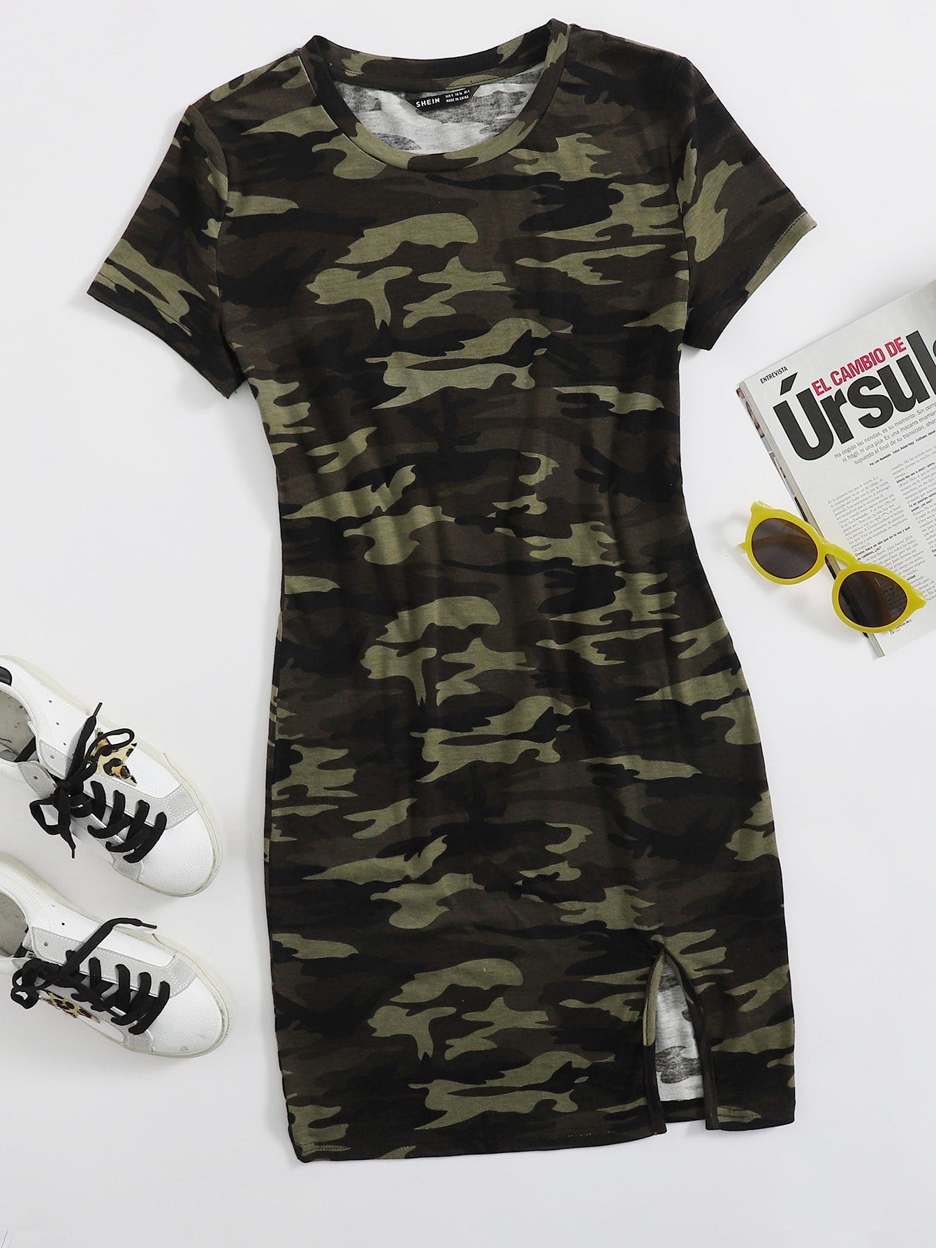 Camo Split Short Sleeve Round Neck Pencil Natural Short Dress
