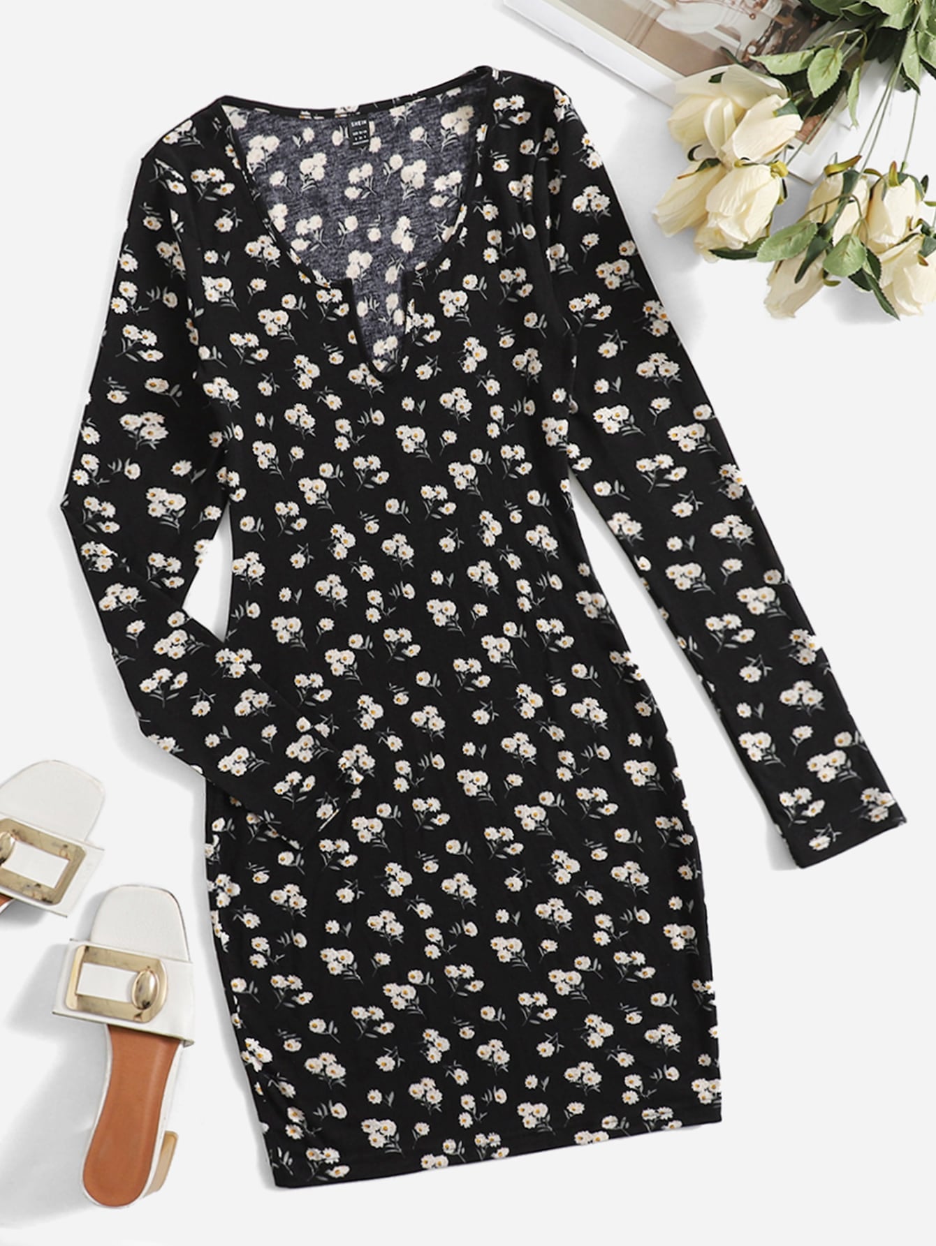 Casual Ditsy Floral Long Sleeve Notched Pencil Natural Short Dress