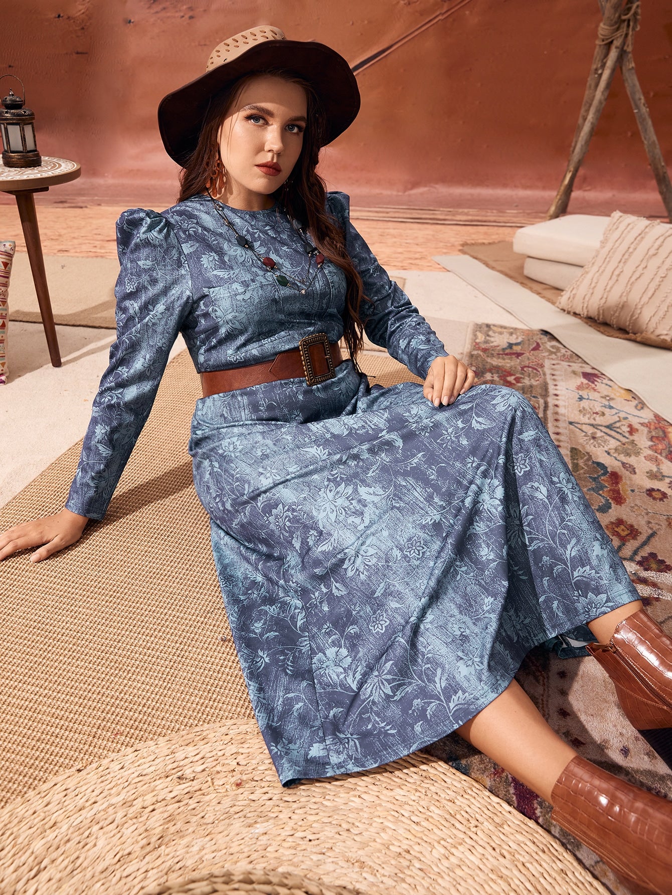 Casual Floral Pocket Long Sleeve Round Neck Straight High Waist Long Plus Size Dress