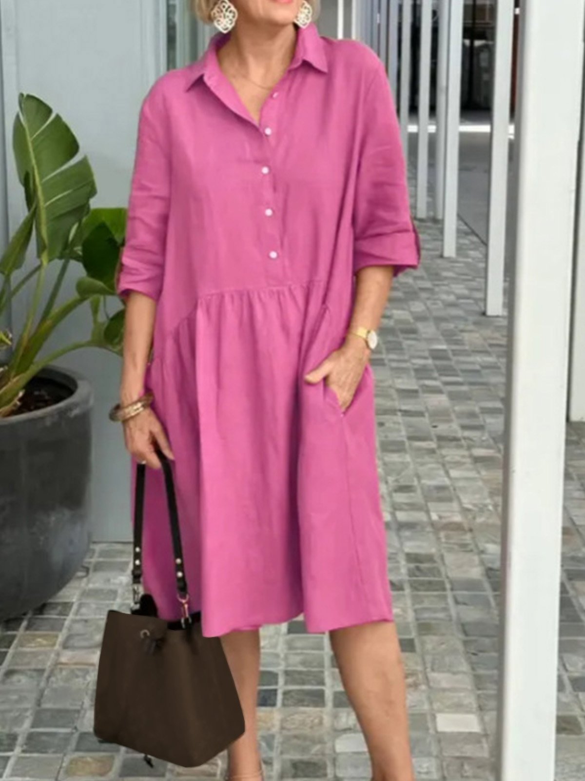 Casual Half Sleeve Shirt Collar Plain Loose Midi Dress