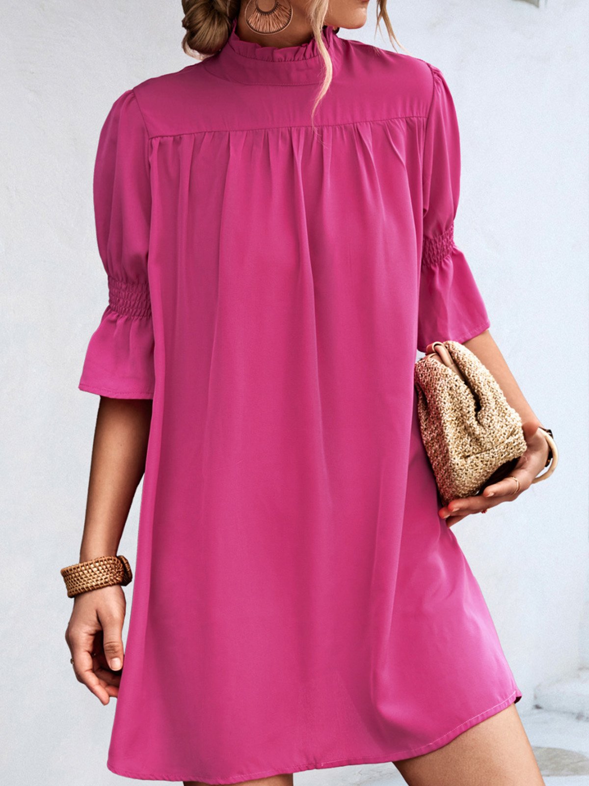 Casual Half Sleeve Stand Collar Plain Loose Short Dress
