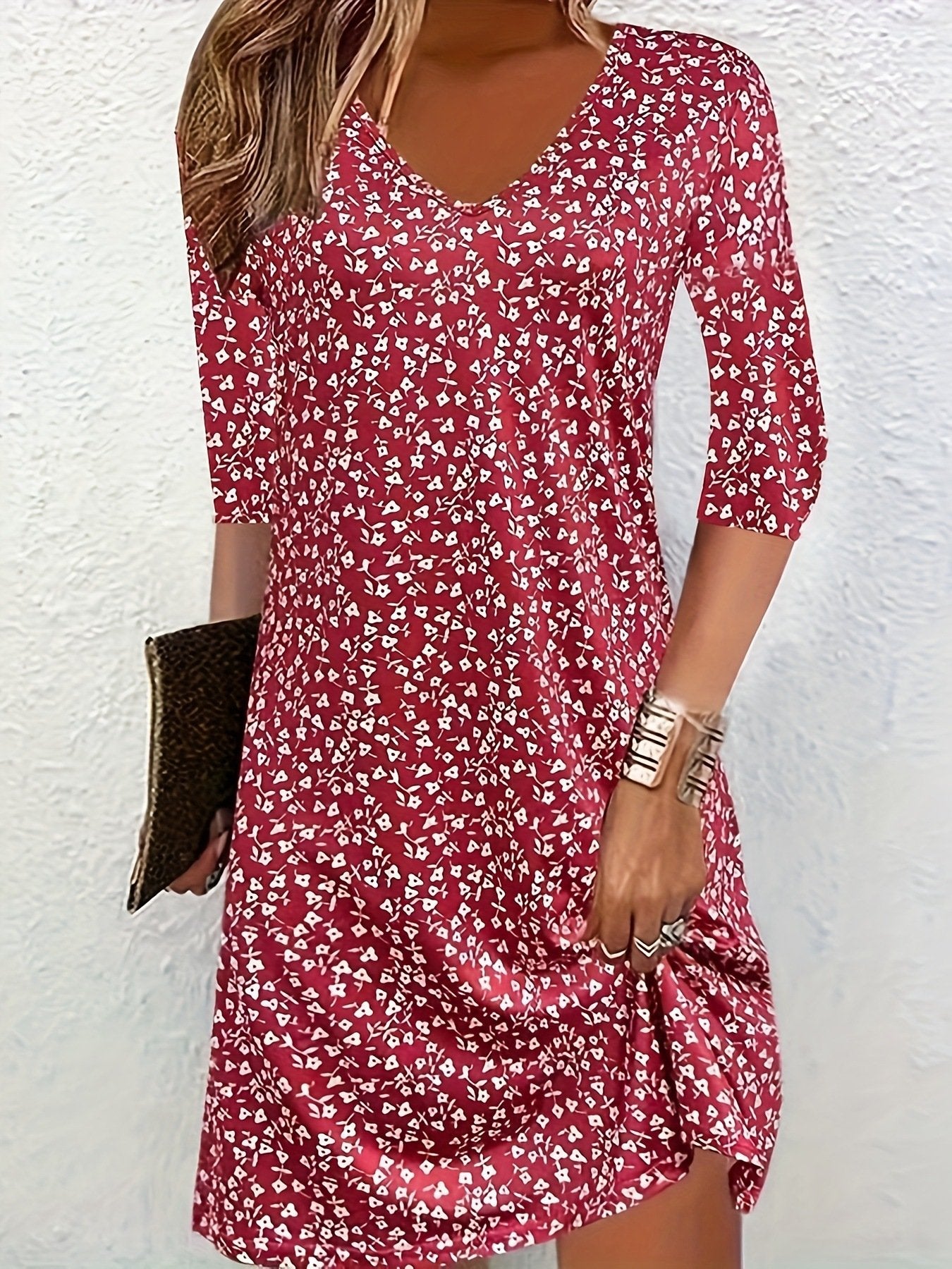 Casual Half Sleeve V Neck Ditsy Floral Loose Midi Dress