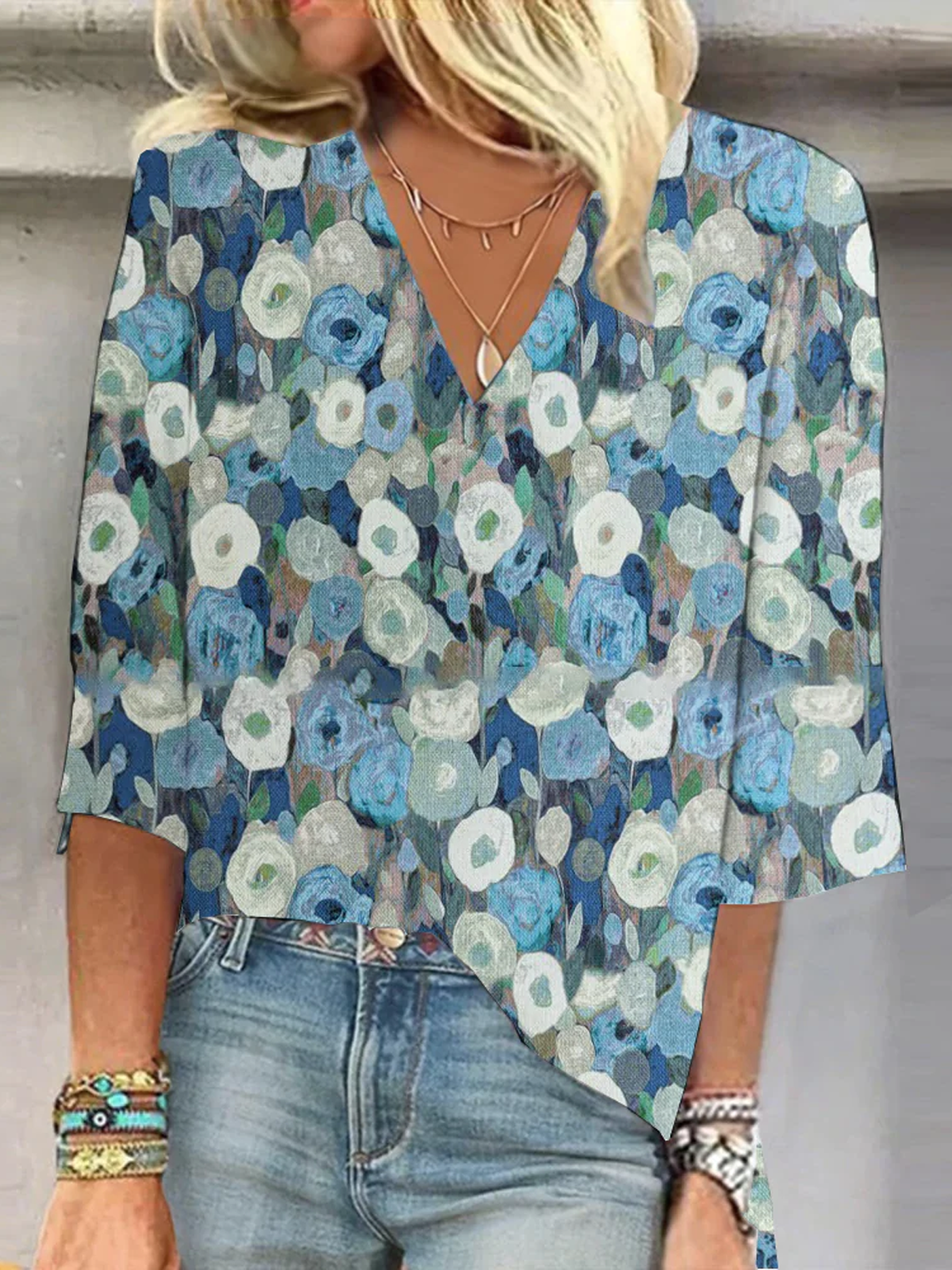 Casual Half Sleeve V Neck Floral Loose Regular Blouse