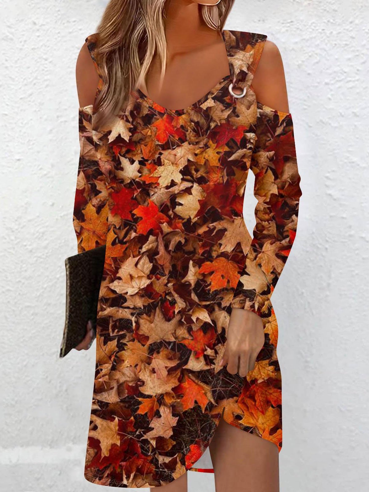 Casual Long Sleeve Cold Shoulder Maple Leaf Loose Short Dress