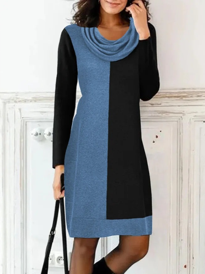 Casual Long Sleeve Turtleneck Color Block Loose Short Dress