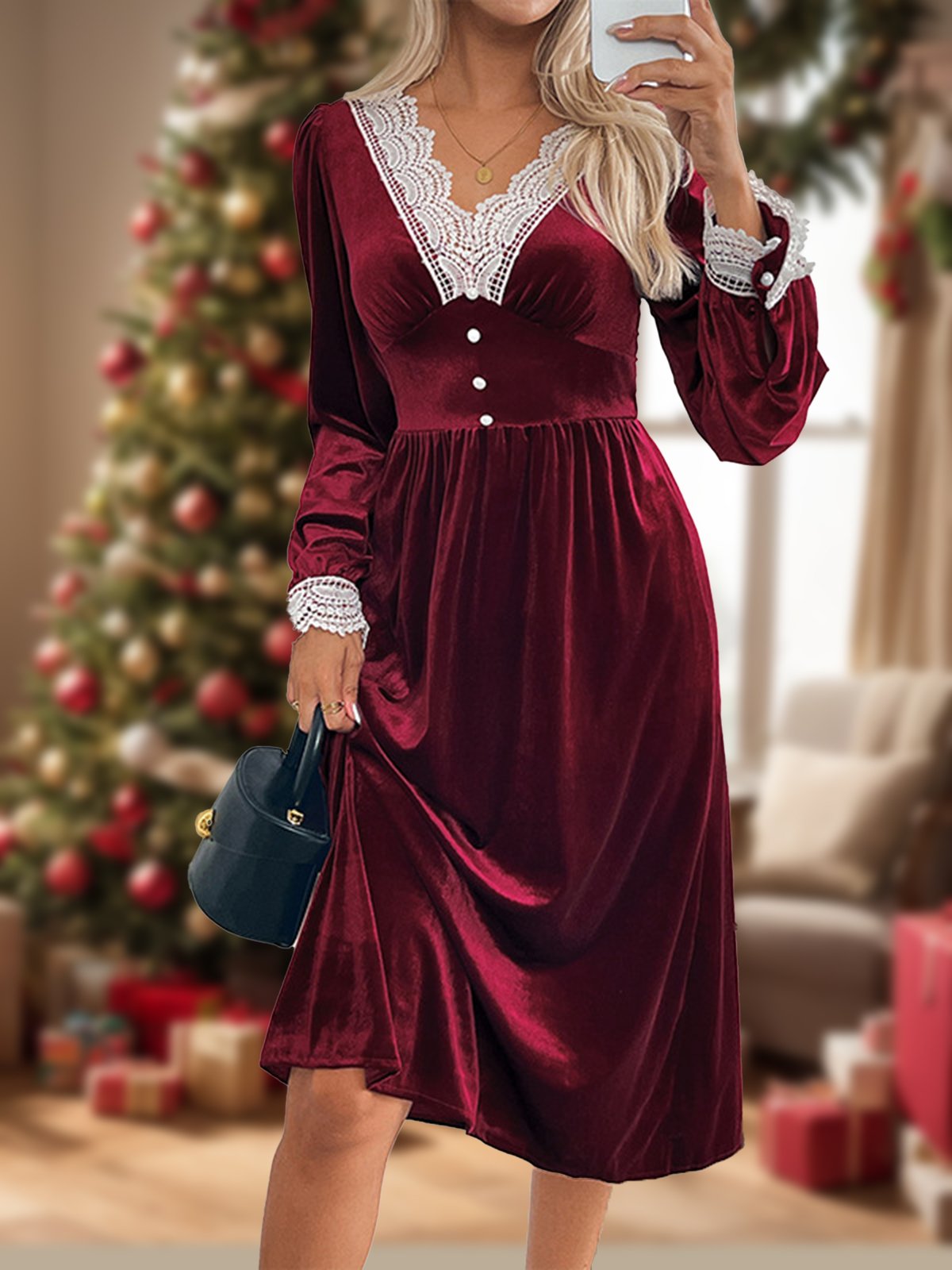 Casual Long Sleeve V Neck Plain Lace Midi Dress