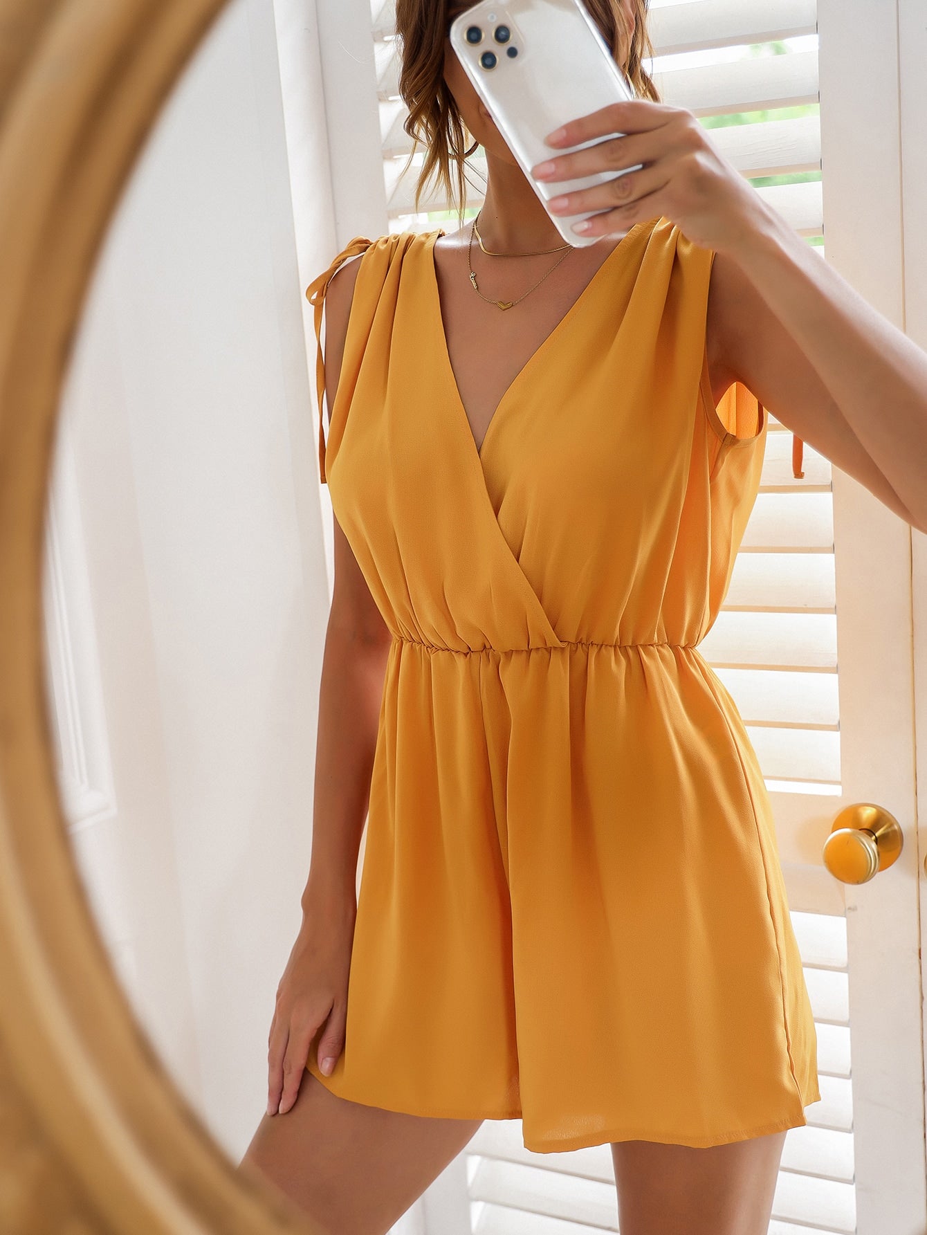 Casual Plain Drawstring Sleeveless V Neck High Waist Short Women Jumpsuit