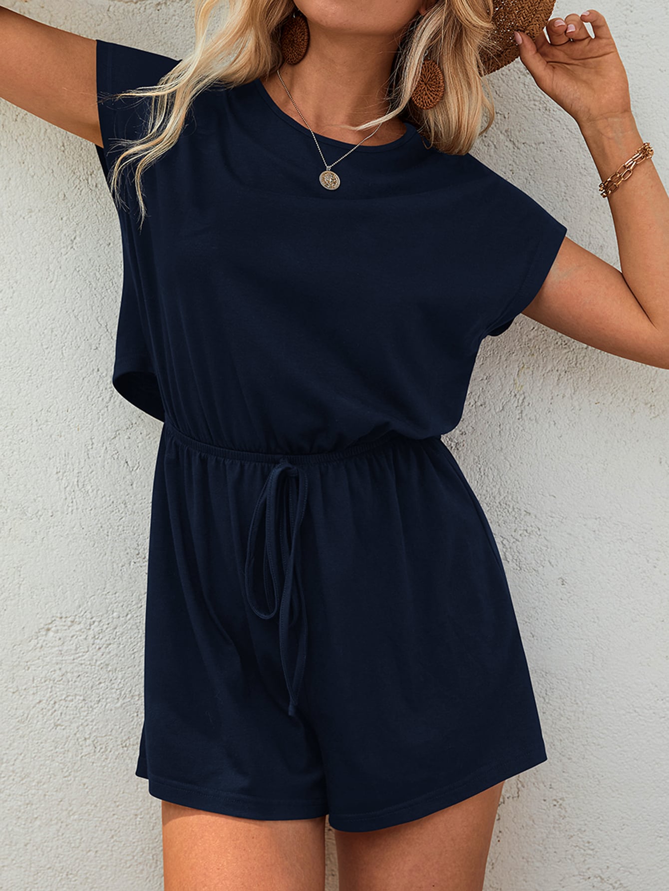 Casual Plain Knot Short Sleeve Round Neck High Waist Short Women Jumpsuit
