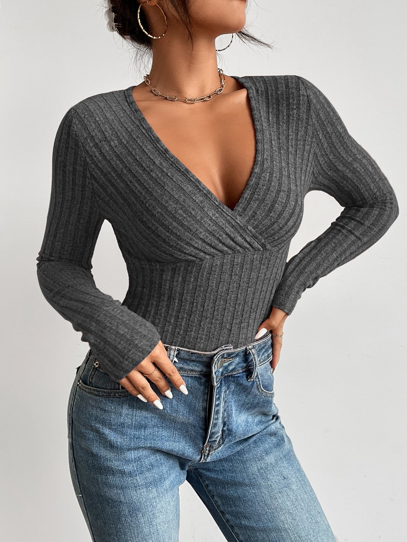 Casual Plain Rib-Knit Long Sleeve Deep V Neck Natural Women Bodysuit