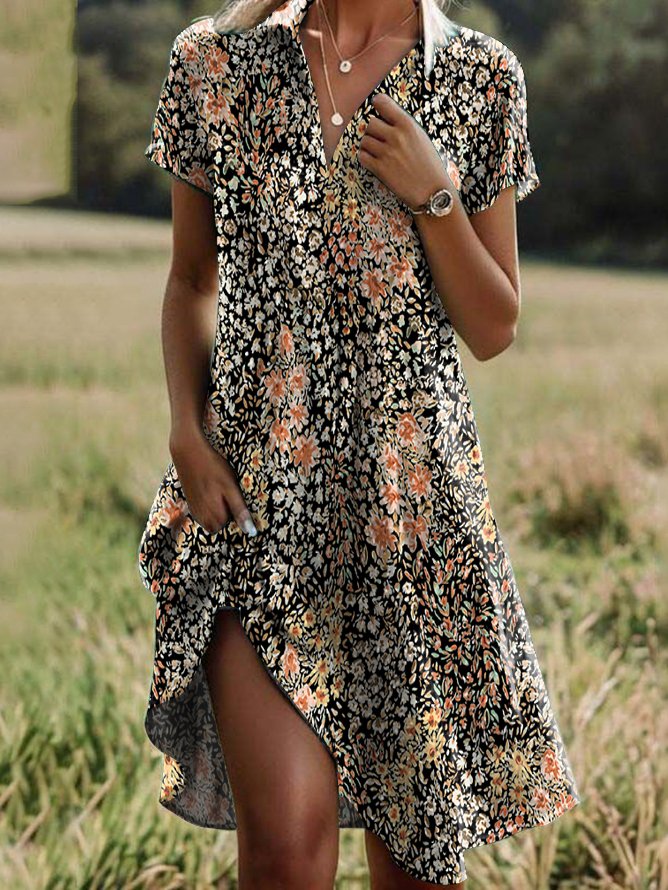 Casual Short Sleeve Shirt Collar Floral Loose Midi Dress