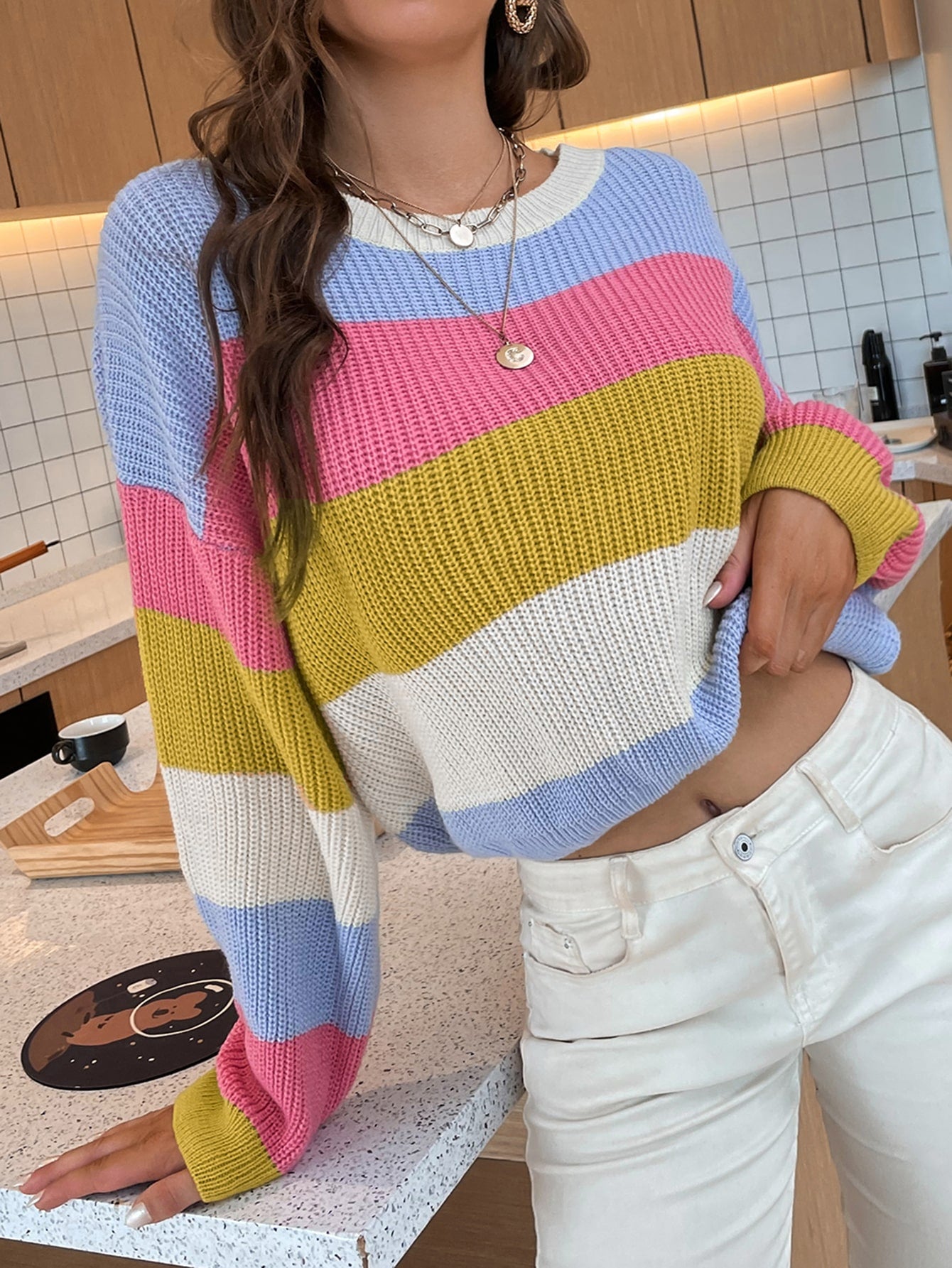 Casual Striped Contrast Binding Long Sleeve Round Neck Regular Women Sweater