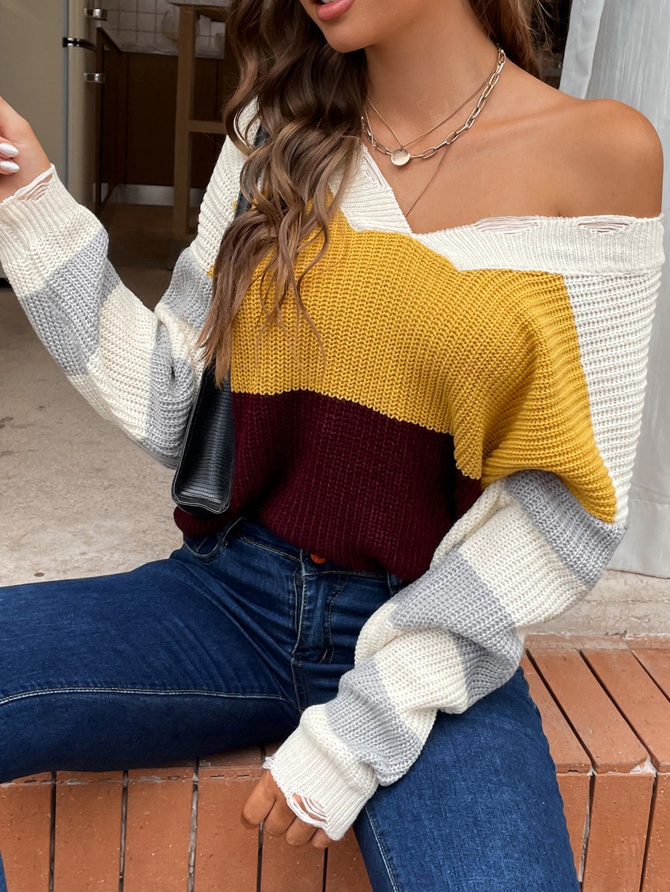 Casual Striped Rib-Knit Long Sleeve V Neck Regular Women Sweater