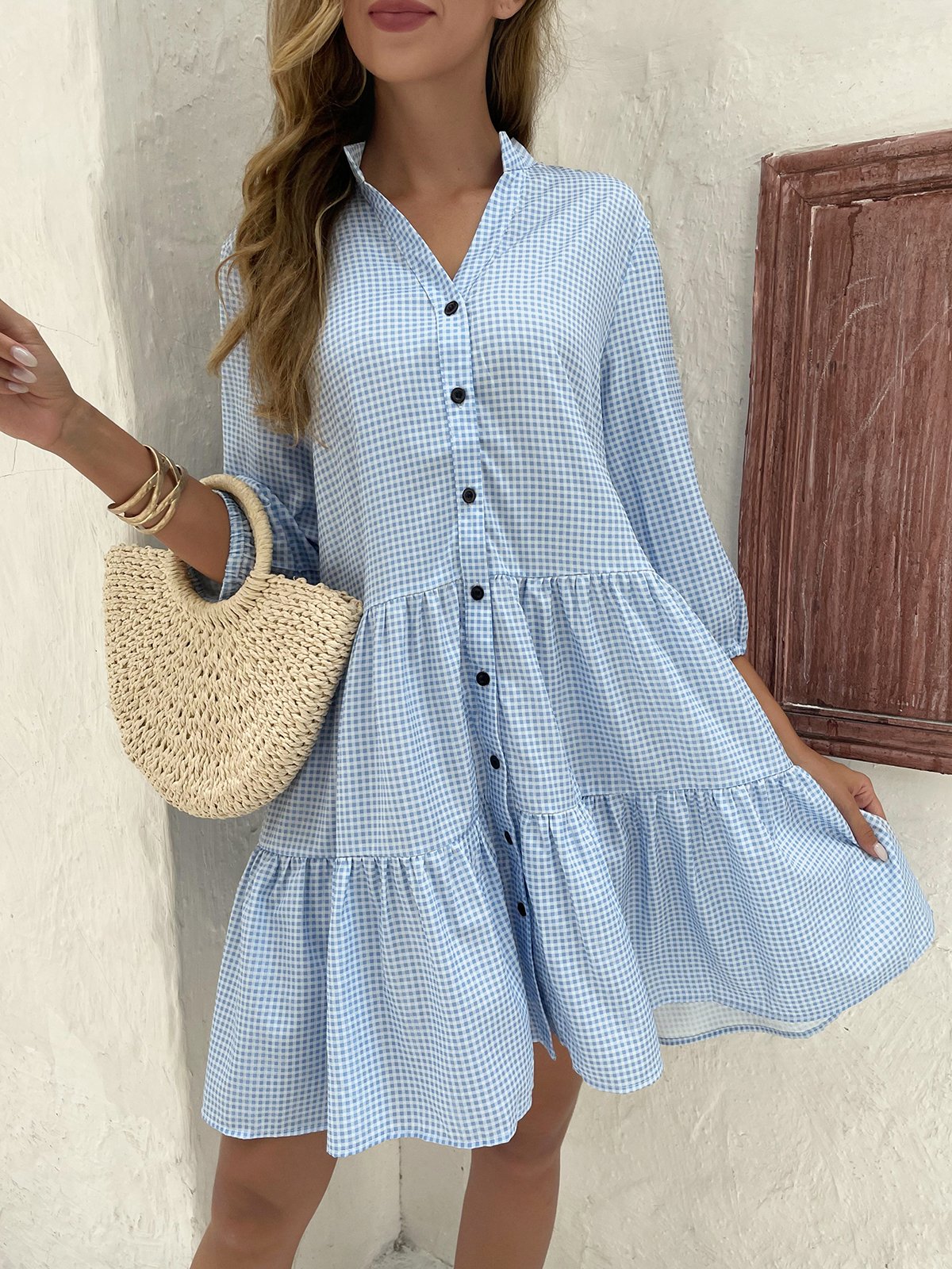 Casual Three Quarter Sleeve Stand Collar Plaid Loose Short Dress
