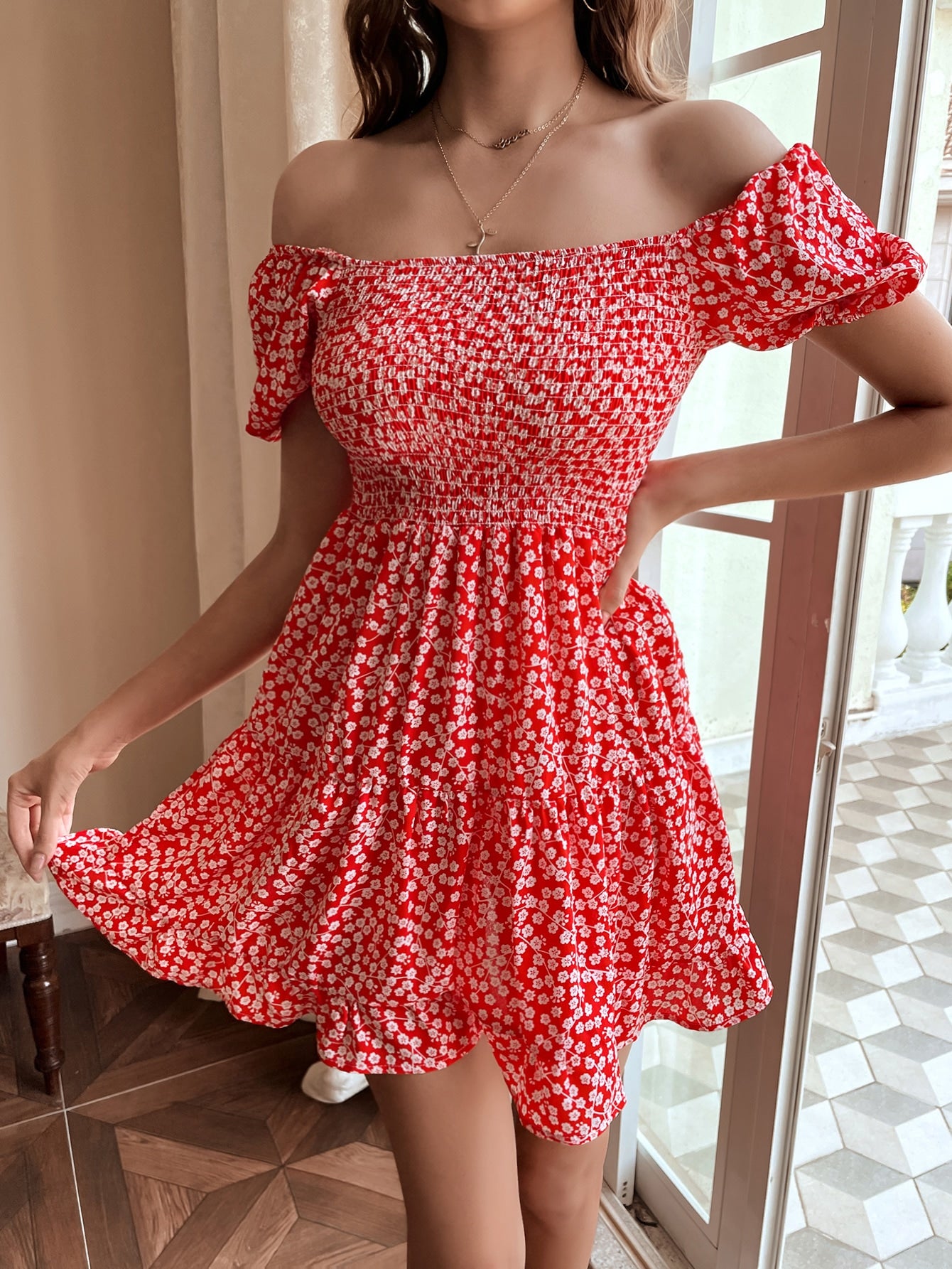 Ditsy Floral Shirred Short Sleeve Off The Shoulder High Waist Short Dress