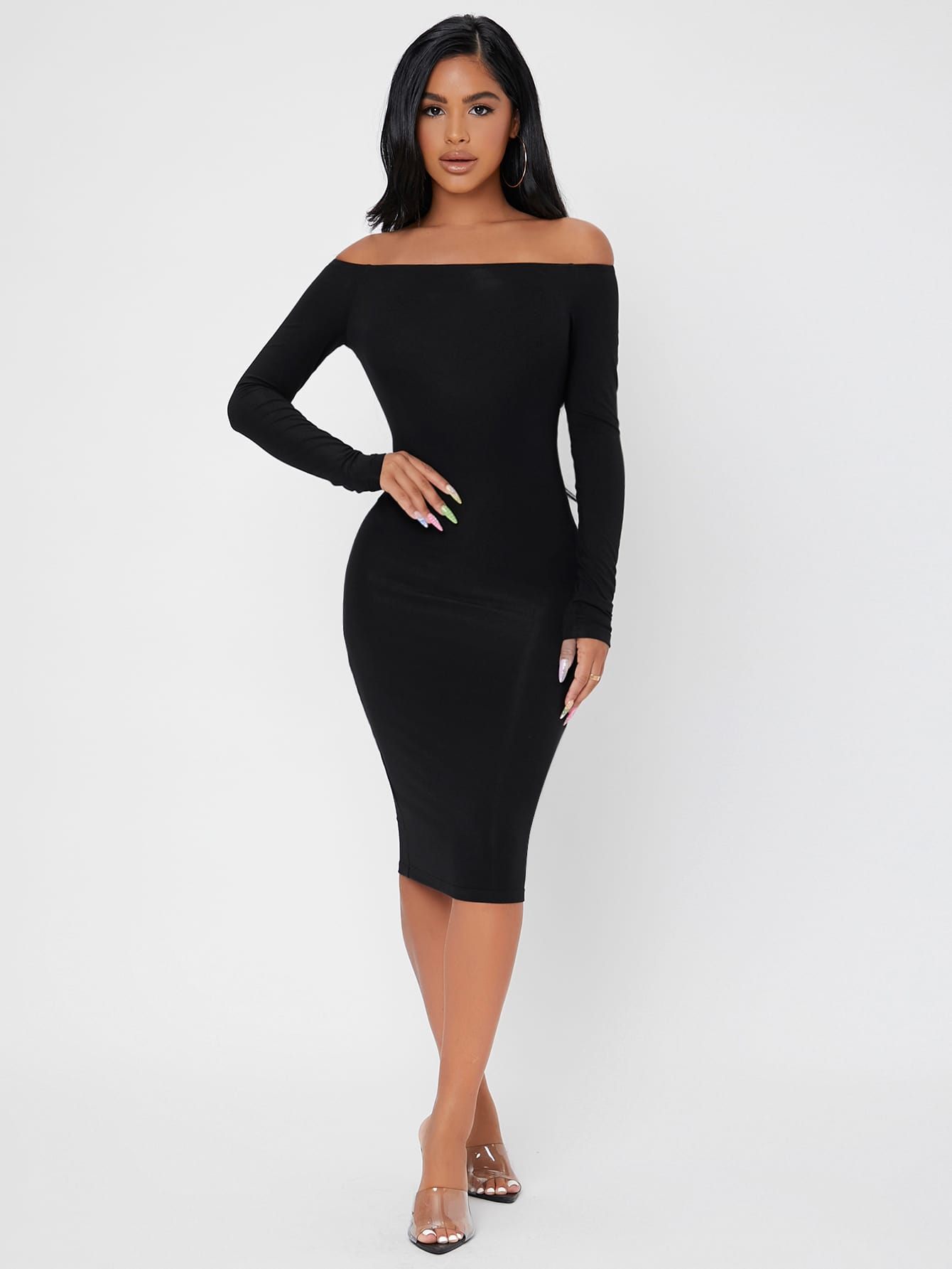 Elegant Plain Long Sleeve Off The Shoulder Pencil Natural Midi Dress
