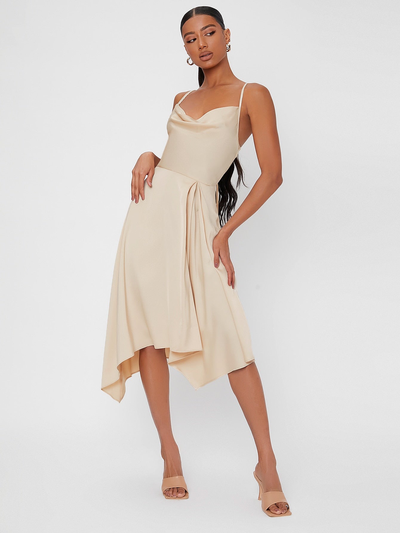 Elegant Plain Tie Back Sleeveless Spaghetti Strap Asymmetrical High Waist Midi Dress