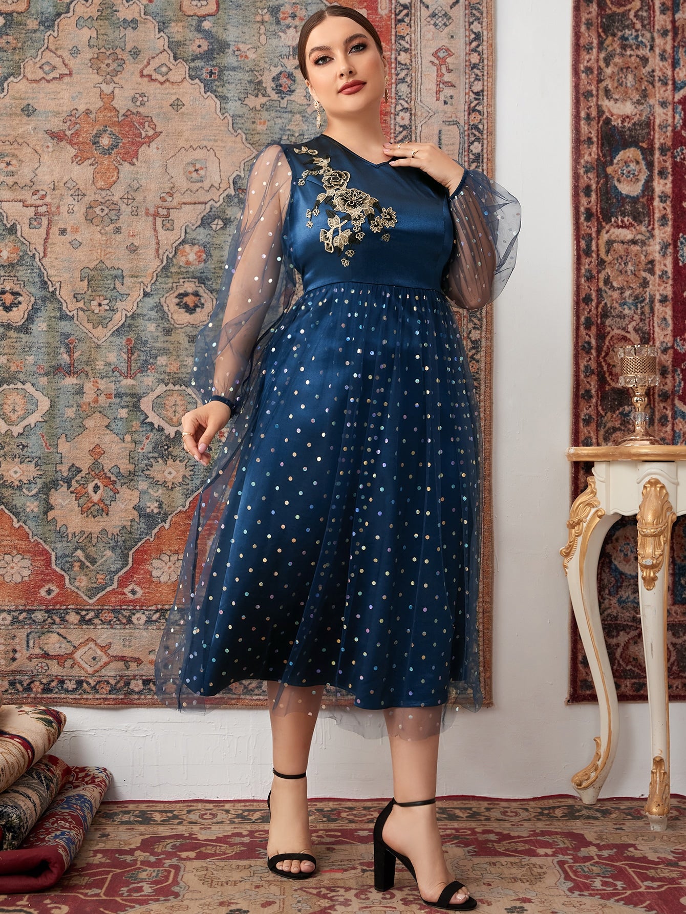 Glamorous Polka Dot Zipper Long Sleeve Round Neck Flared High Waist Long Plus Size Dress