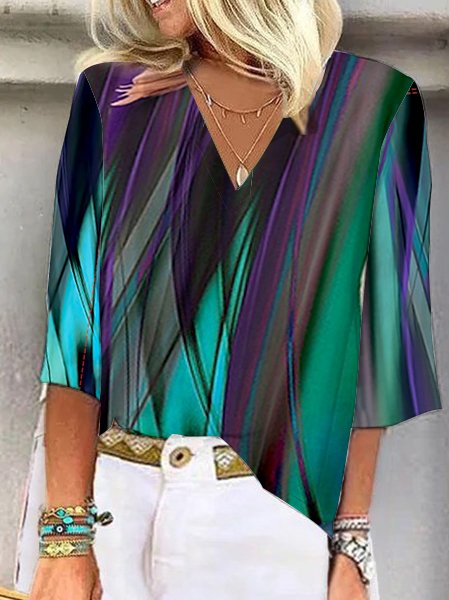 Loose Half Sleeve V Neck Gradient Pattern Casual Regular Blouse