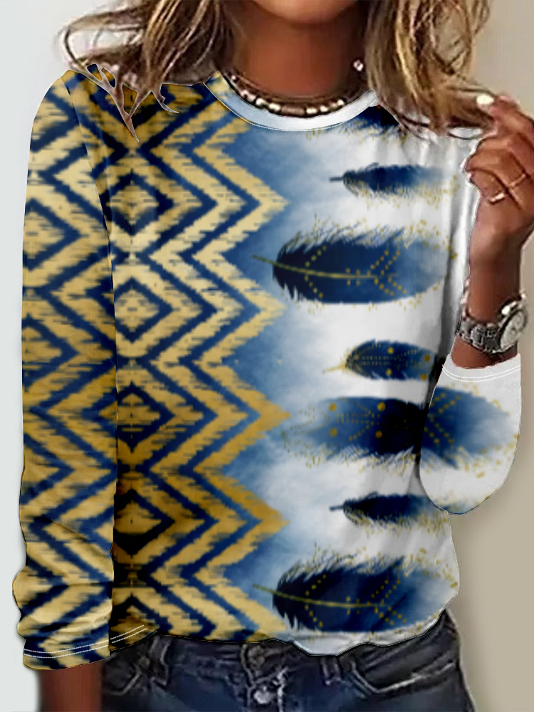 Loose Long Sleeve Crew Neck Abstract Casual Regular T-Shirt