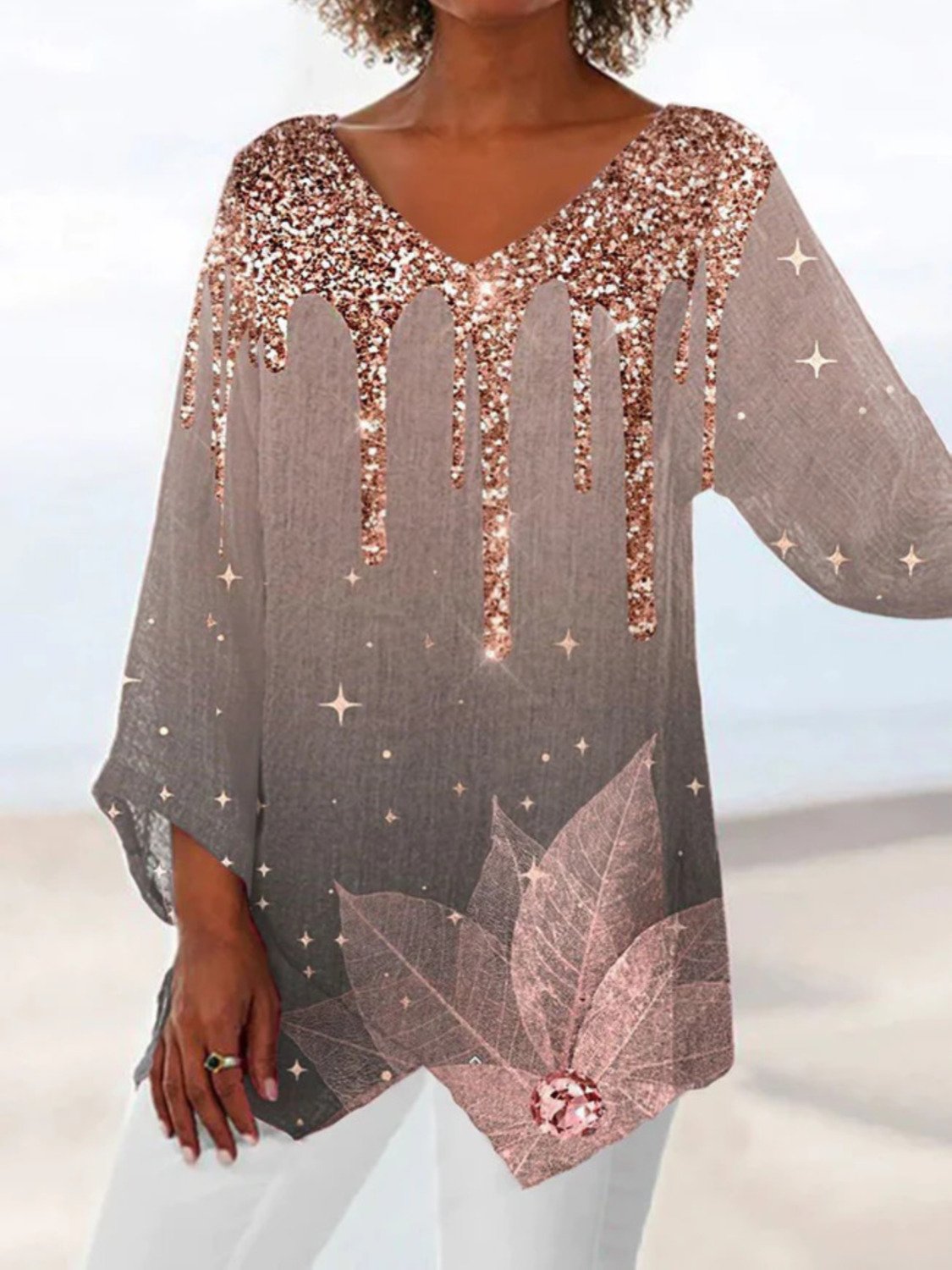 Loose Long Sleeve V Neck Abstract Casual Regular Blouse