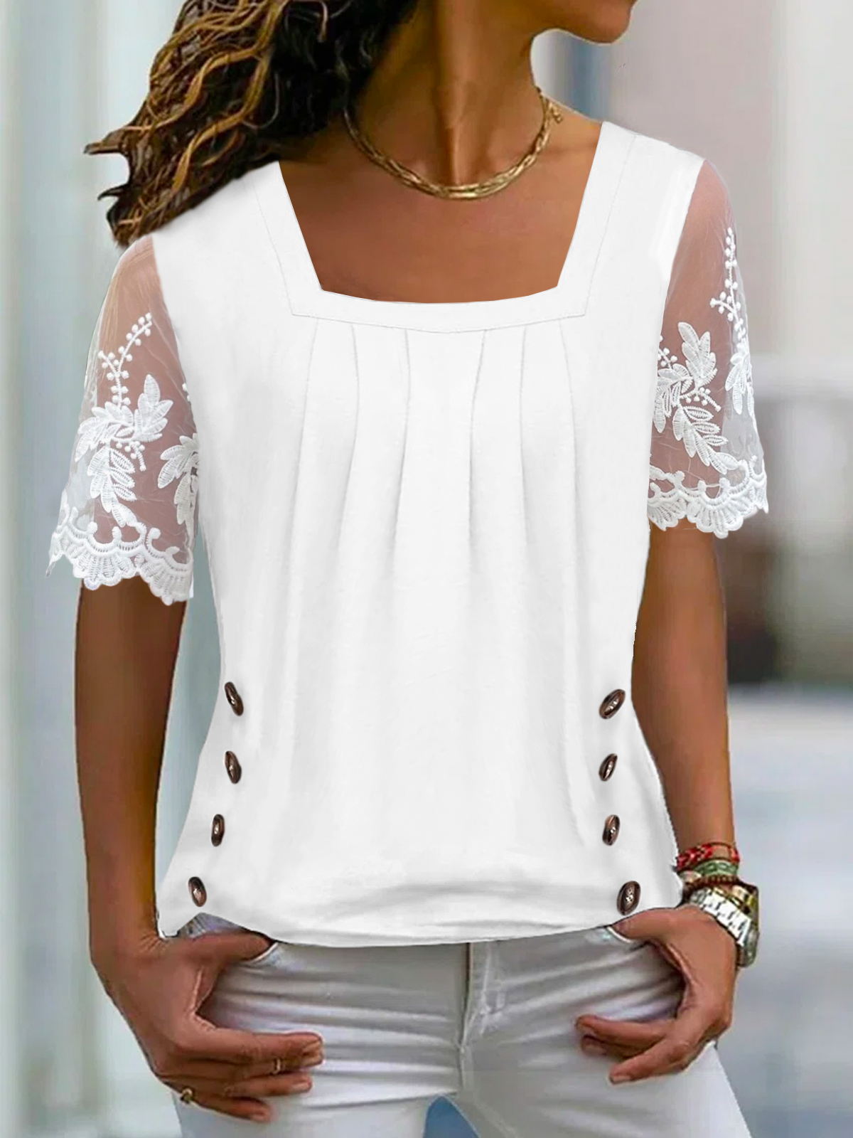 Loose Short Sleeve Square Neck Plain Casual Regular Blouse