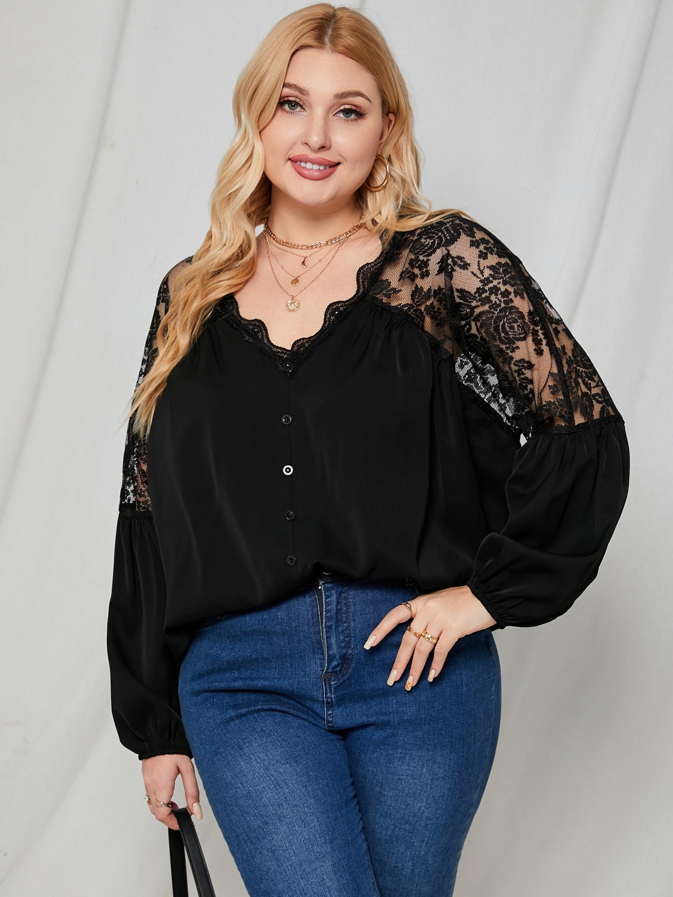 Plain Button Front Long Sleeve V Neck Regular Plus Size Blouse
