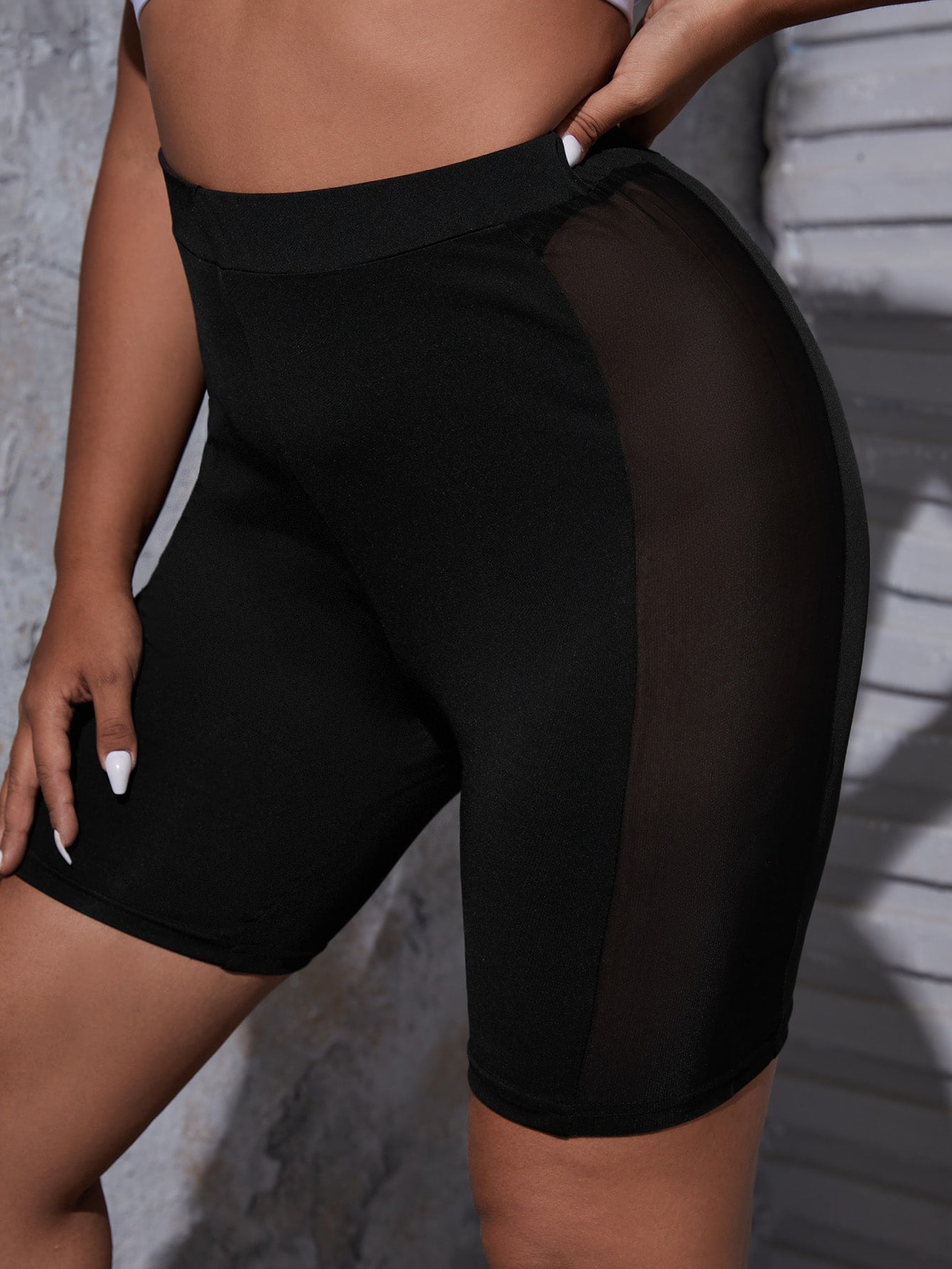 Plain Contrast Mesh Semi-Sheer Short Plus Size Leggings