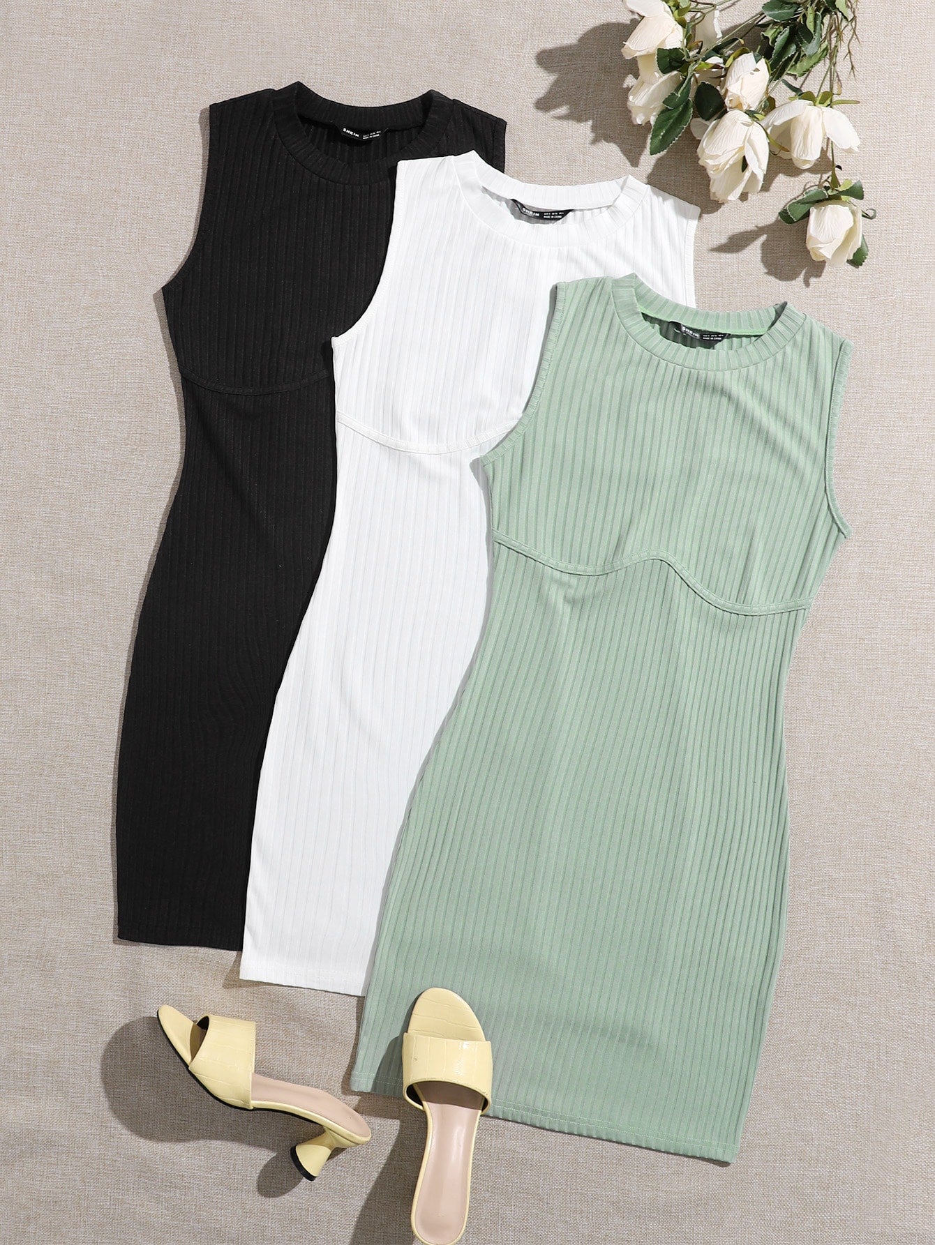 Plain Rib-Knit Sleeveless Round Neck Pencil High Waist Mini Dress
