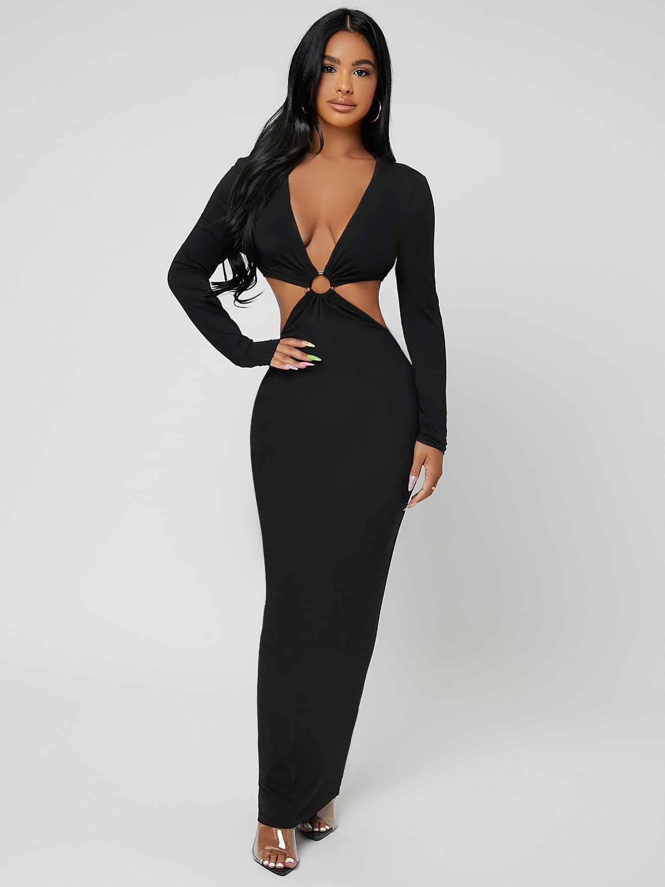 Plain Ring Long Sleeve Round Neck Pencil Natural Maxi Dress