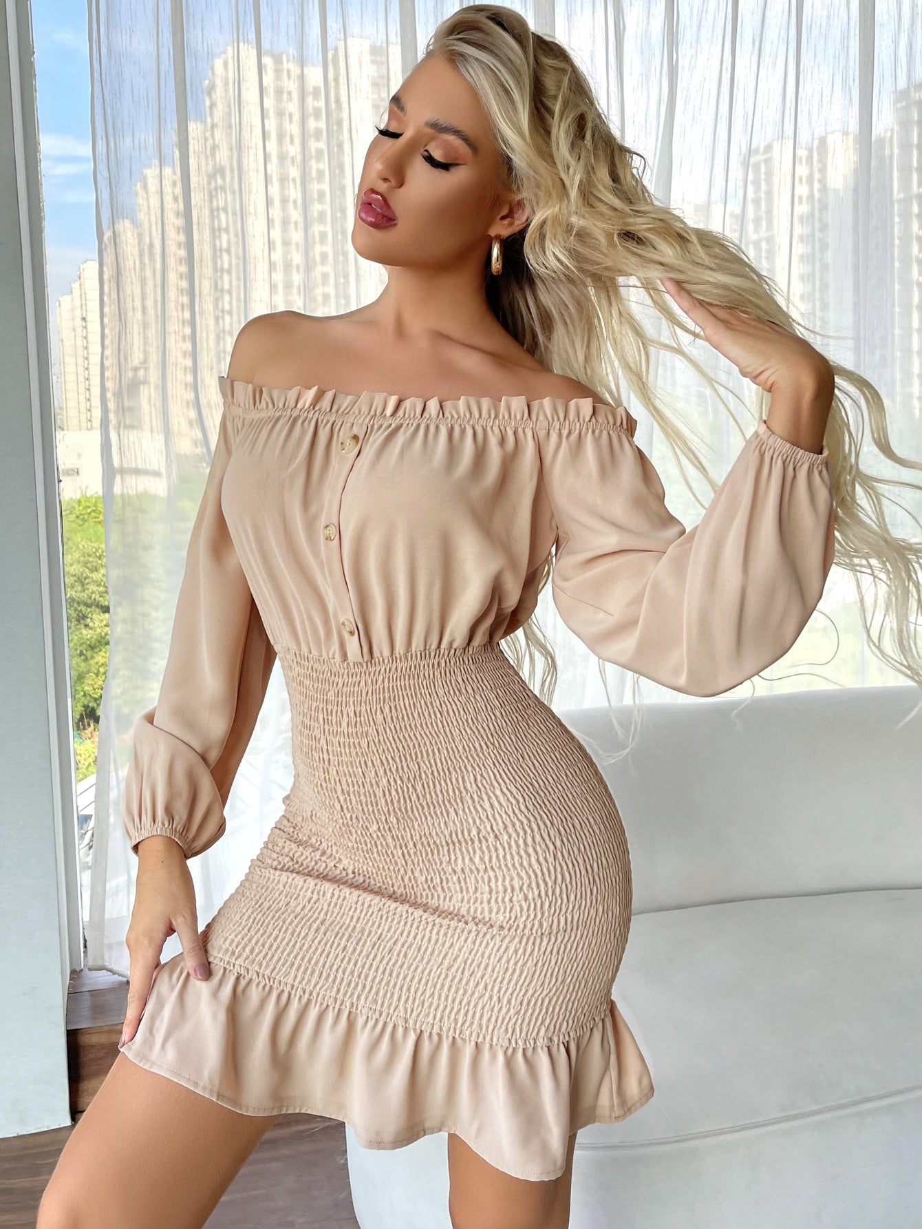 Plain Shirred Long Sleeve Off The Shoulder Flounce High Waist Short Dress