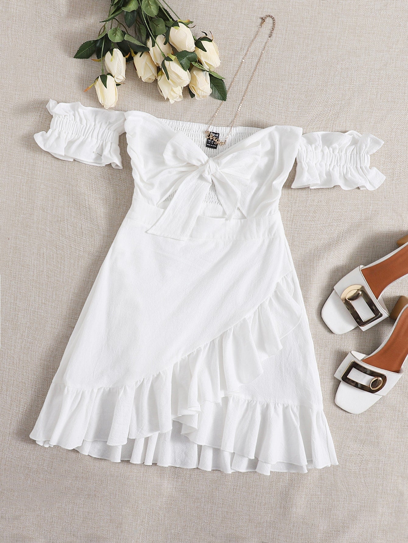 Plain Tie Front Short Sleeve Off The Shoulder Wrap High Waist Short Dress