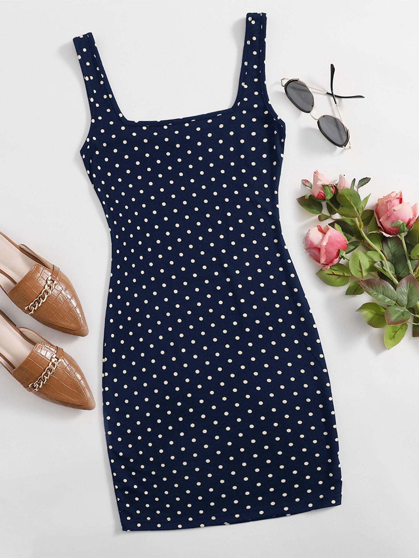 Polka Dot Sleeveless Square Neck Pencil Natural Mini Dress