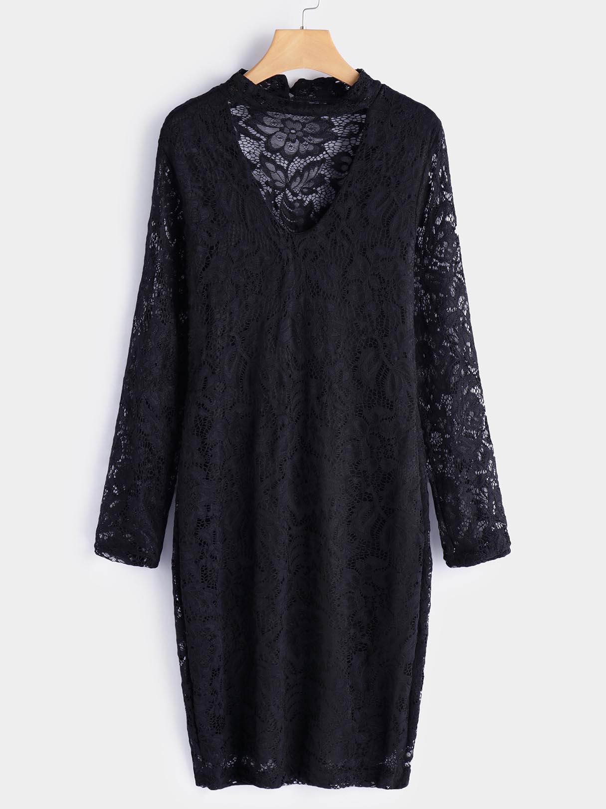 Groothandel swart V-nek langmou geborduurde gehekelde kant versierde ruglose hol midi rok
