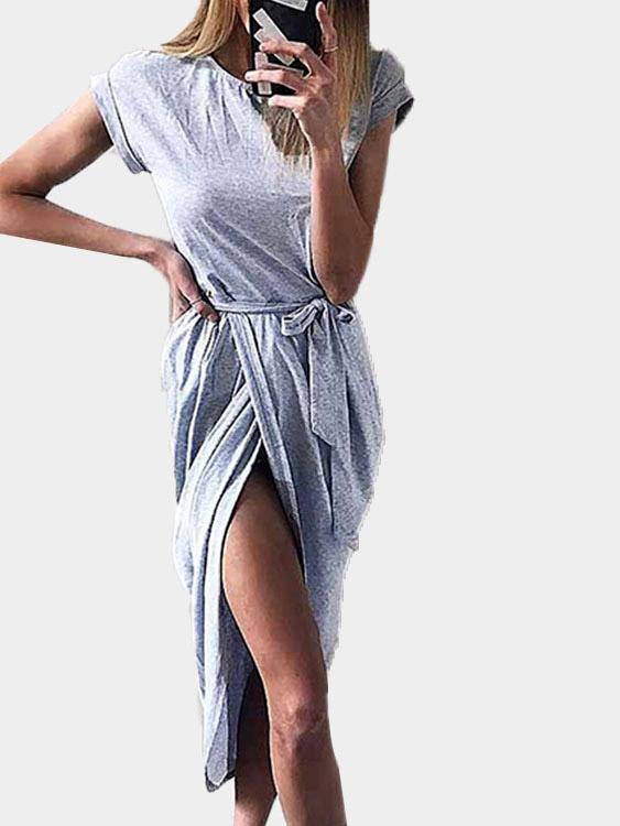 Groothandel grys ronde nek kortmou spleetzoom Midi-rok