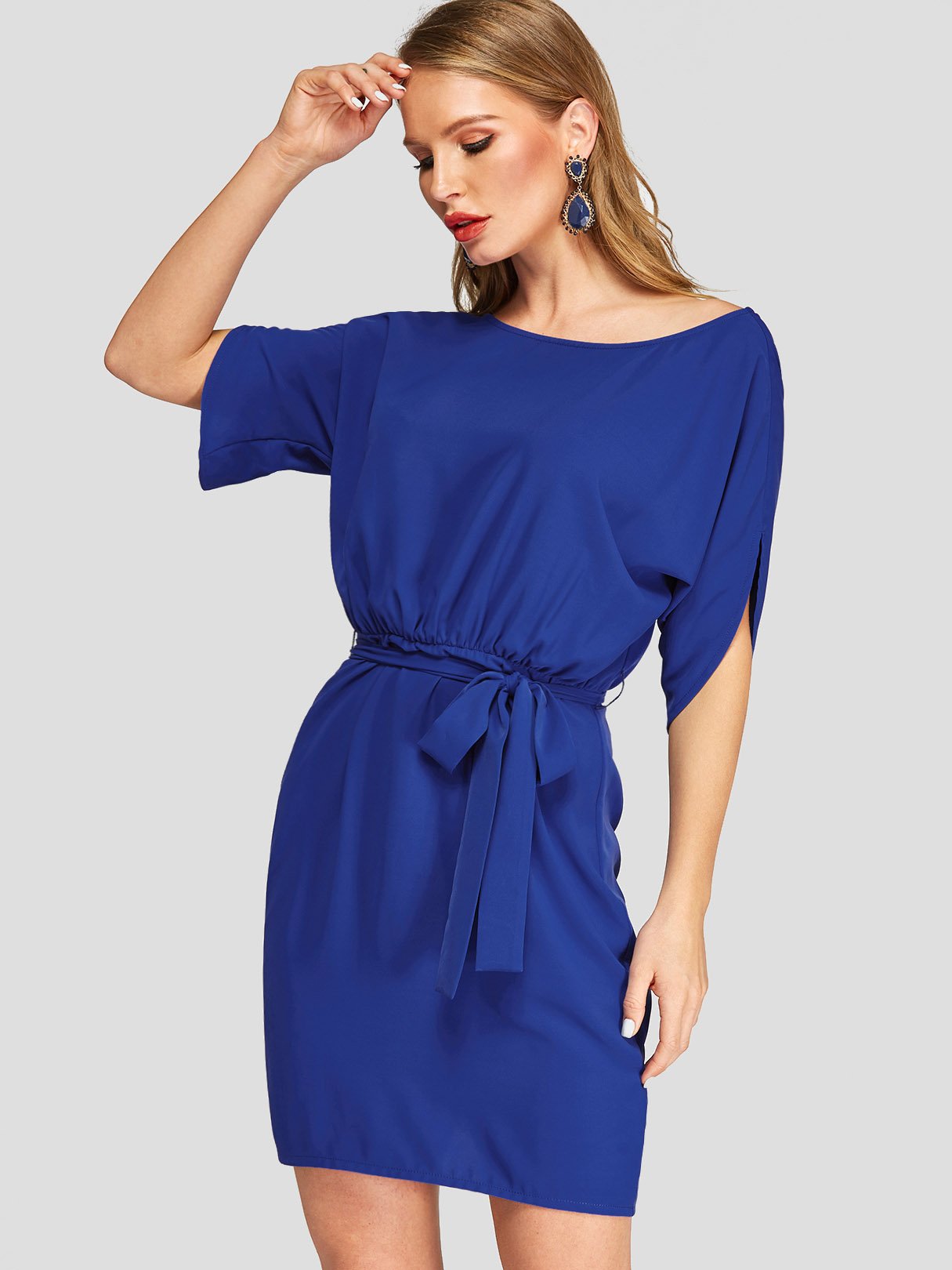 Groothandel Koningsblou Ronde nek Halfmou Plain Belt Toevallige rok