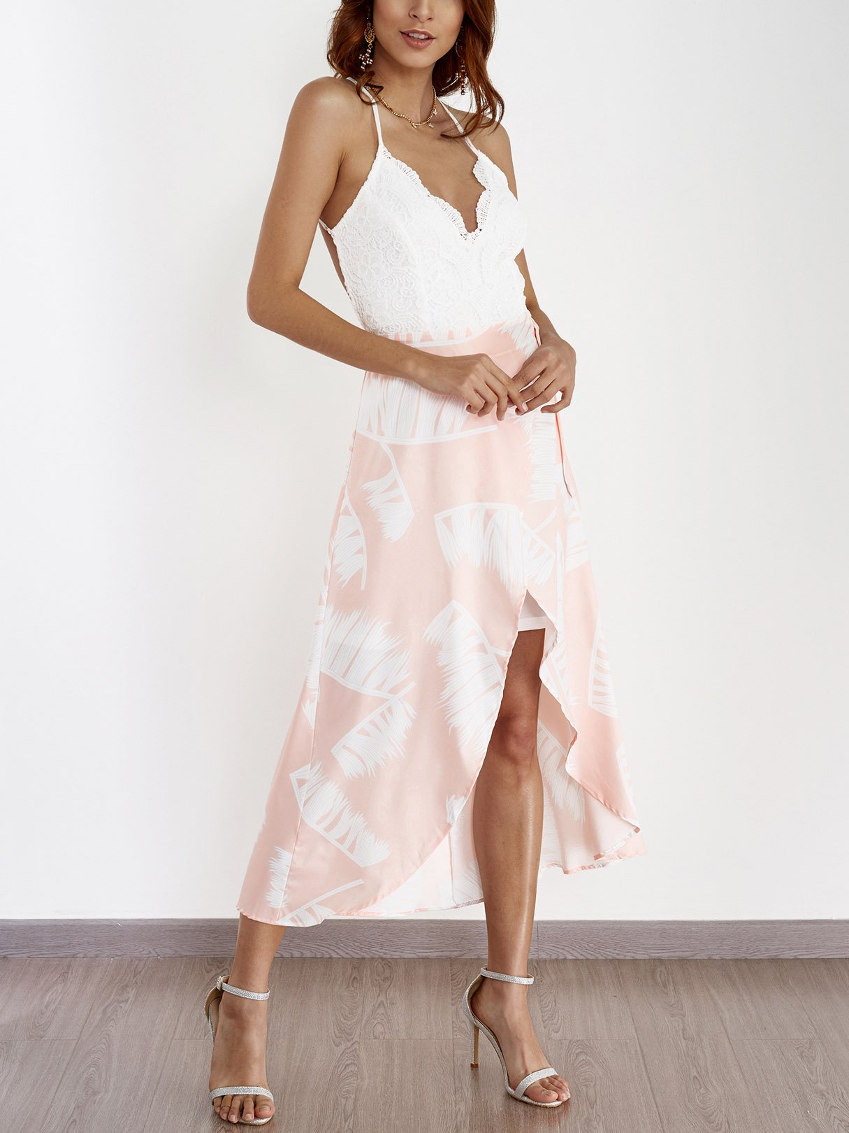 Groothandel Wit Diep V-nek Mouwlose Gedrukte Ruglose Spleetsoom Midi-rok