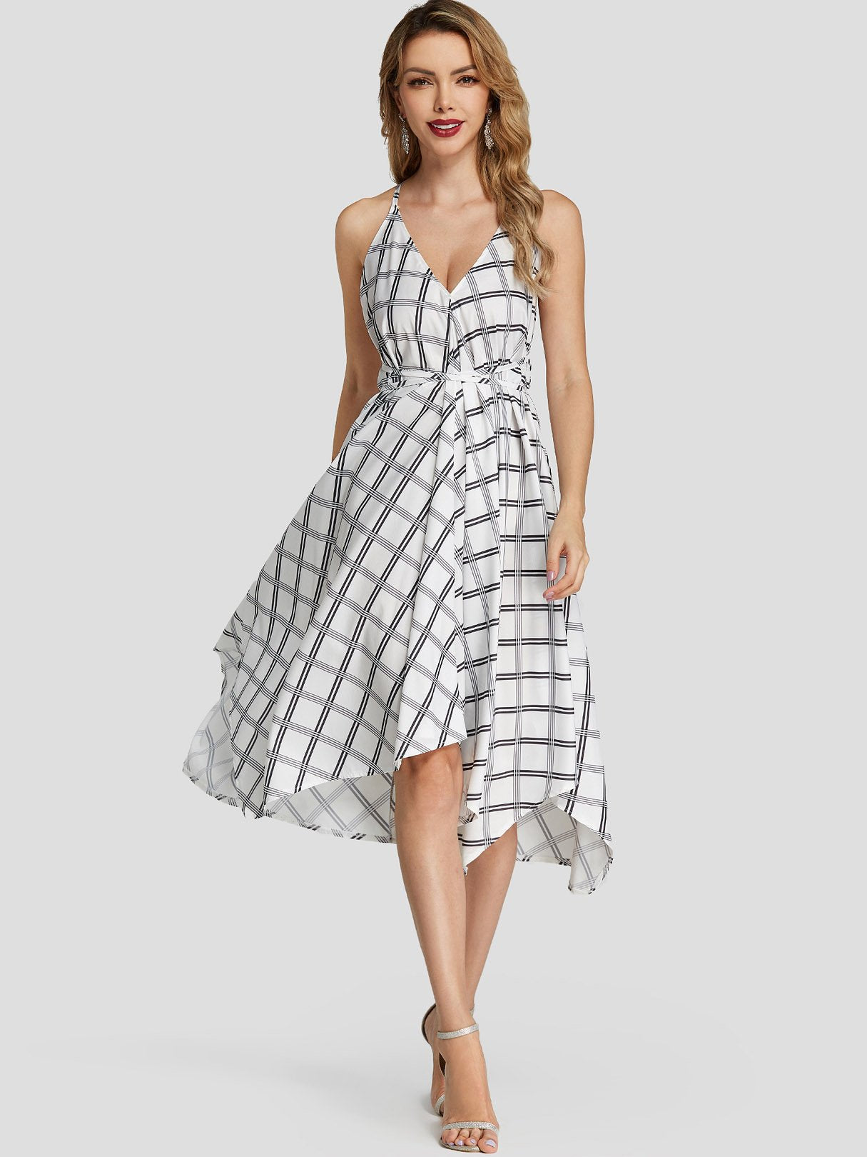 Groothandel wit V-nek moulose geometriese self-tie kruis-kruis onreëlmatige soom midi-rokke