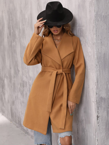 Plain Belted Long Sleeve Waterfall Midi Women Overcoat