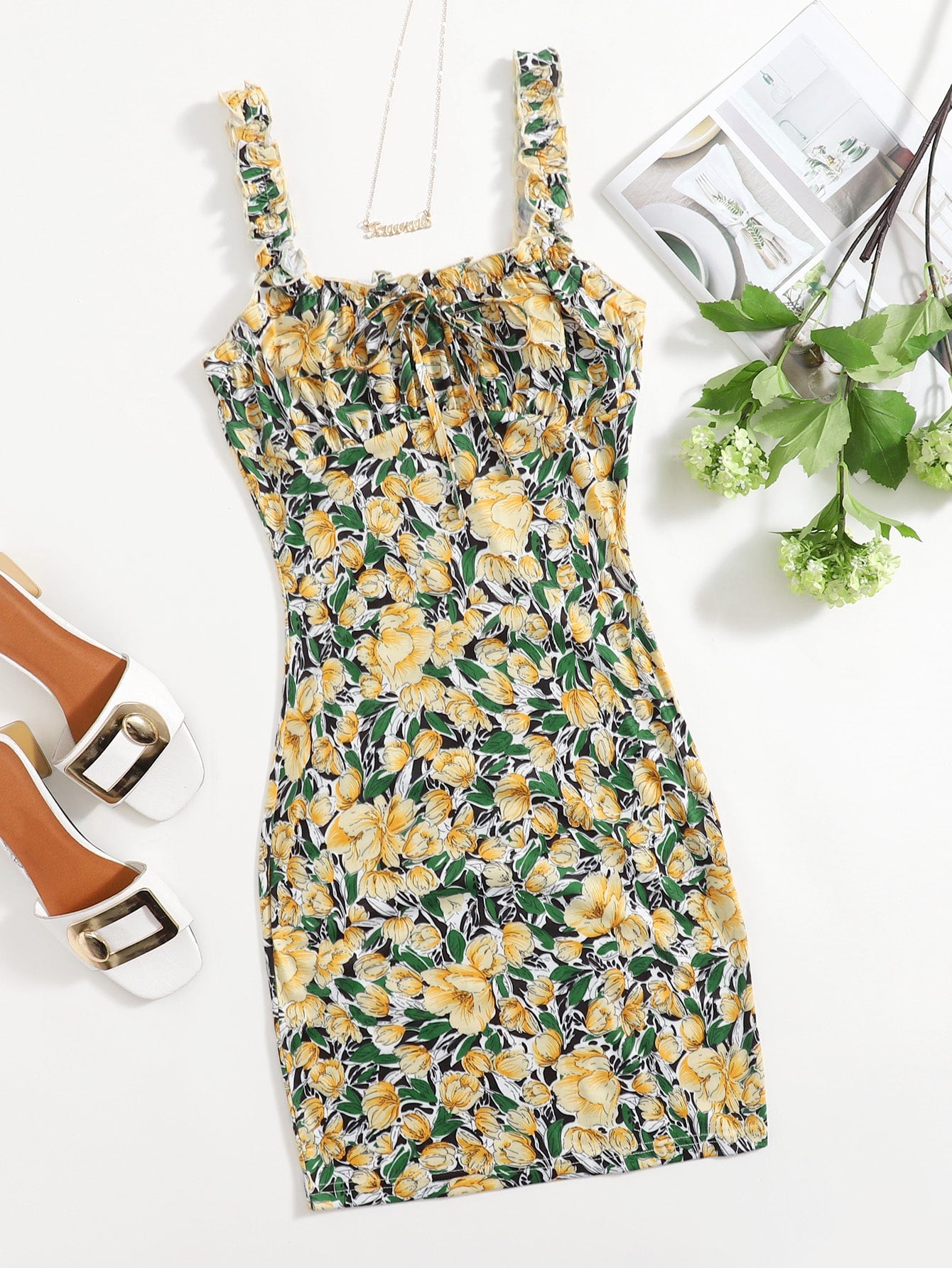 All Over Print Ruched Bust Sleeveless Straps Pencil Natural Short Womens Dress