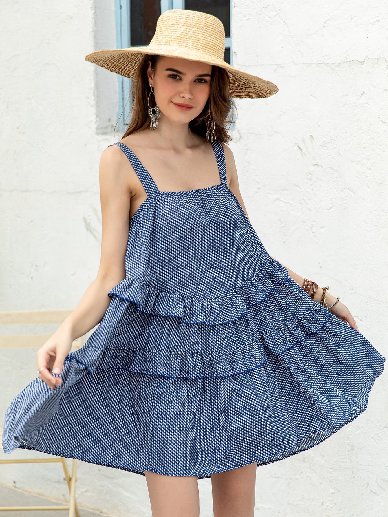 All Over Print Ruffle Hem Sleeveless Straps Flared Natural Short Dress