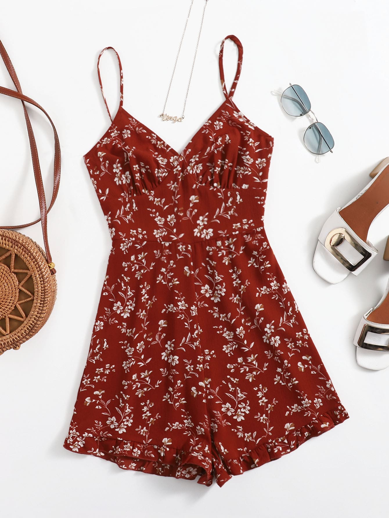 Boho All Over Print Shirred Sleeveless Spaghetti Strap High Waist Short Women Jumpsuit