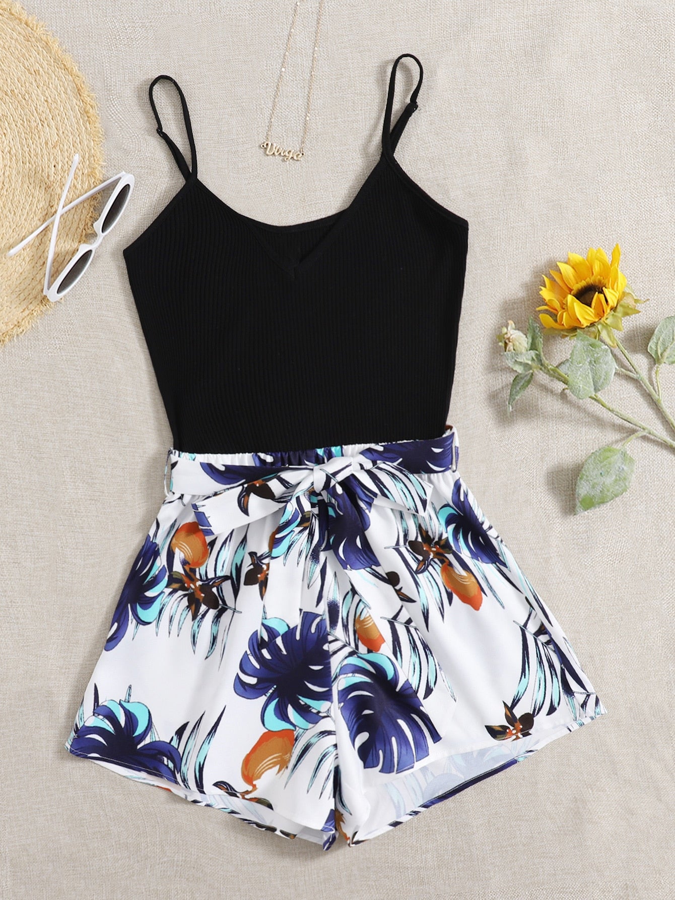 Boho Colorblock Rib-Knit Sleeveless Spaghetti Strap High Waist Short Women Jumpsuit