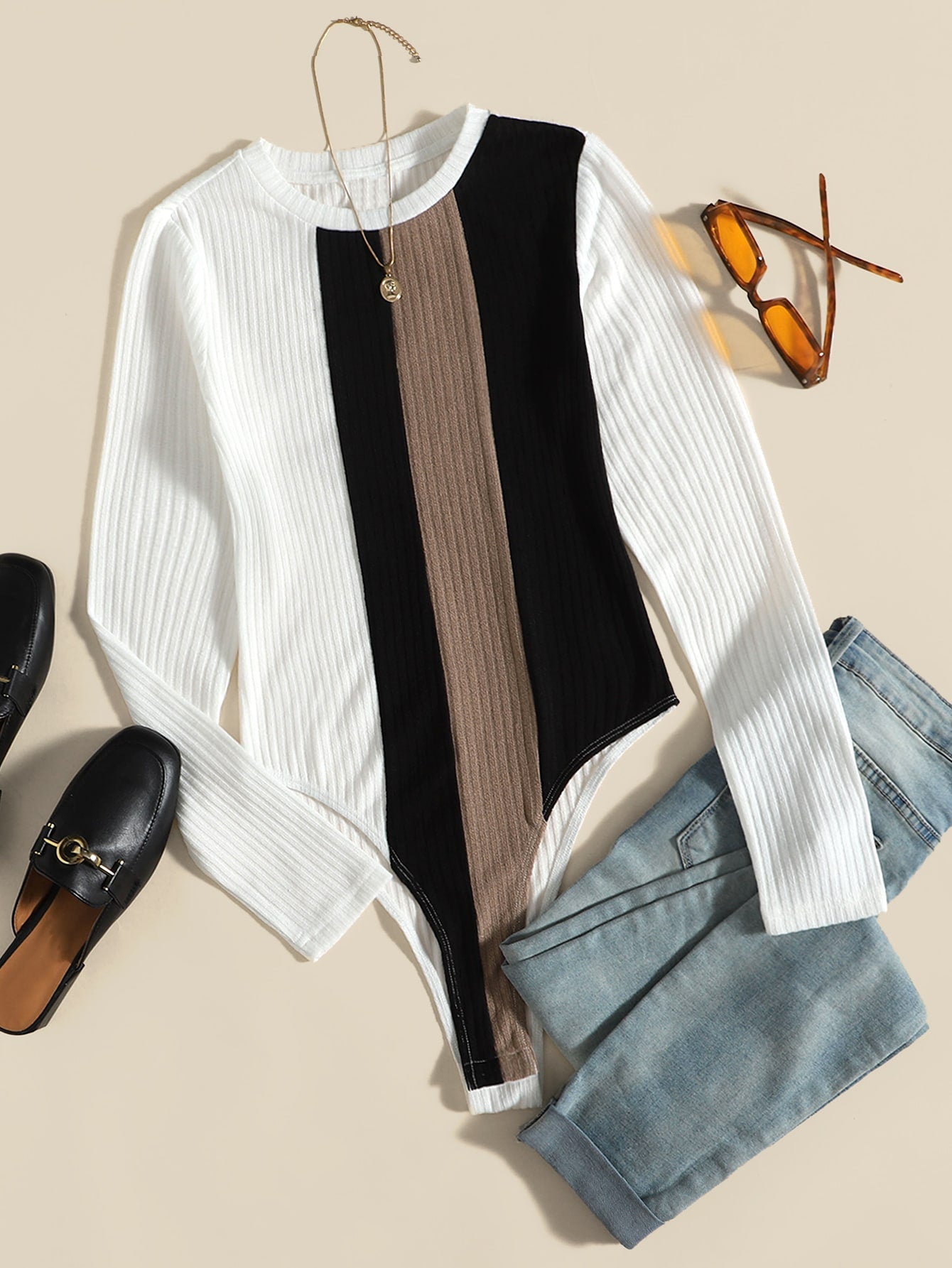 Casual Colorblock Rib-Knit Long Sleeve Round Neck Women Bodysuit